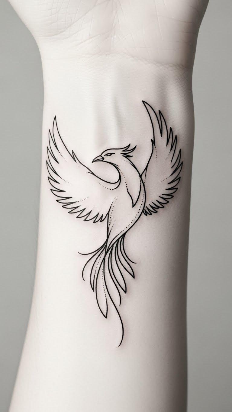 A wrist tattoo of a Phoenix with graceful curves brings a delicate yet powerful symbol of resilience right to your skin.