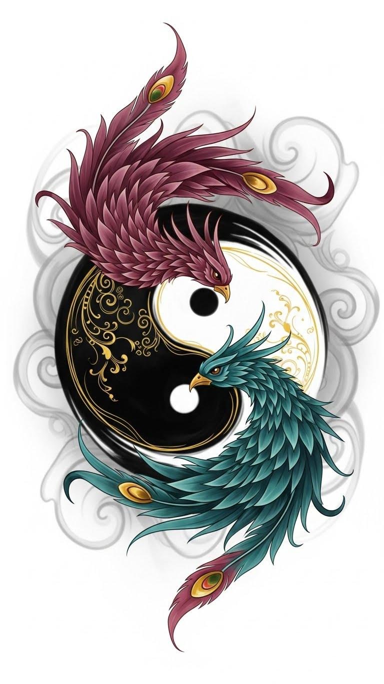 The design marries cultural symbolism with personal meaning: the Fenghuang’s integrated yin-yang pose conveys inner balance and renewal, while the vibrant palette and gold highlights evoke vitality and sacredness. Emotionally it aims to empower and soothe—pride in heritage, calm through symmetry. Best placed along the upper back, sternum, or over the shoulder blade so the flowing curve follows natural body lines; scale and feather detail can be adjusted for a bold centerpiece or a more discreet, intimate talisman.