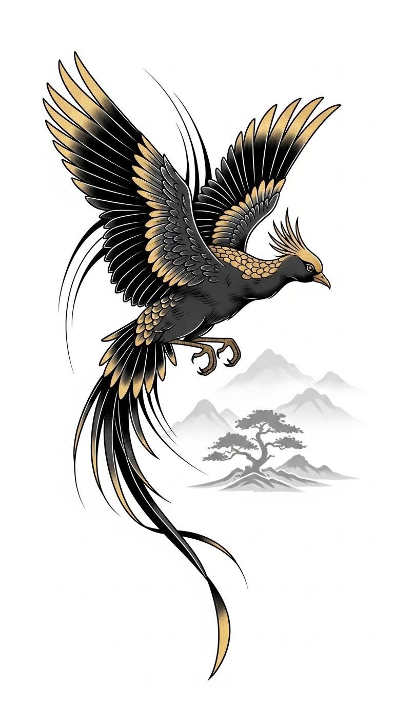 This enchanting depiction reflects Bonghwang symbolism, embodying peace and prosperity as rooted in Korean mythology. Its soaring wings represent freedom and aspiration, making it a powerful tattoo choice that celebrates cultural significance and the journey toward personal transformation.