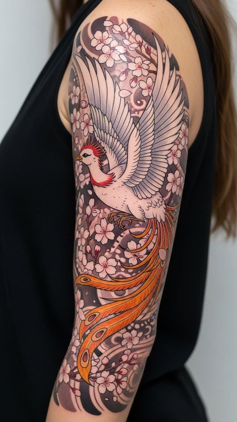 Soaring gracefully above a carpet of delicate cherry blossoms, the Japanese Ho-o, or Phoenix, weaves a narrative of renewal and beauty. This tattoo design embodies Japanese symbolism, merging Ho-o mythology with cherry blossom significance. It represents spiritual growth and harmony concepts, celebrating seasonal beauty. Whether on your back or forearm, this cultural fusion captures nature’s essence and invites freedom in art styles.