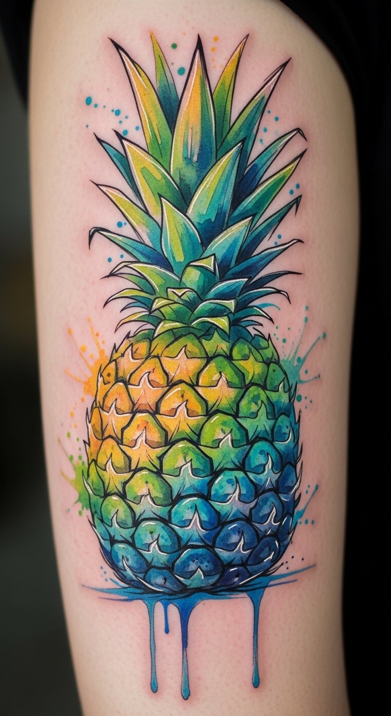 This design centers a stylized pineapple rendered in saturated watercolor hues—golden yellows with sunset oranges, lime greens for the crown, and subtle teal splashes suggesting ocean spray—accented by fine-line white highlights for a glossy, sunlit effect. Surrounding elements include tiny hibiscus blooms, a minimalist sunburst, and a faint wave pattern that can curve with the body. Symbolically it celebrates warmth, hospitality, and joyful memories; emotionally it evokes carefree summer energy and playful nostalgia. Ideal placements are the forearm or ankle for visibility, the shoulder blade for a broader composition, or behind the ribcage for a more intimate, personal reminder.