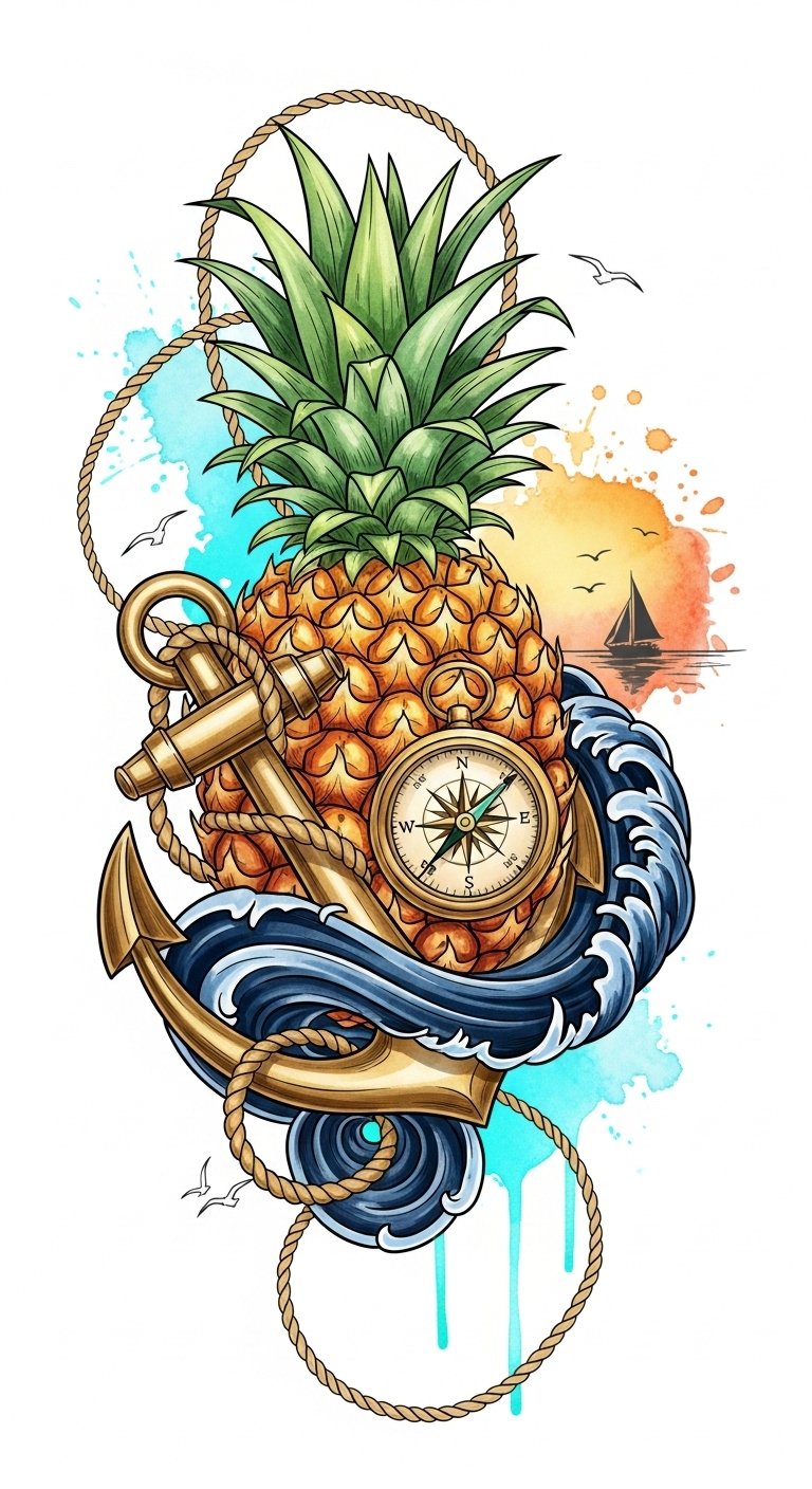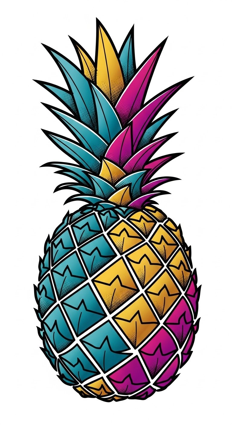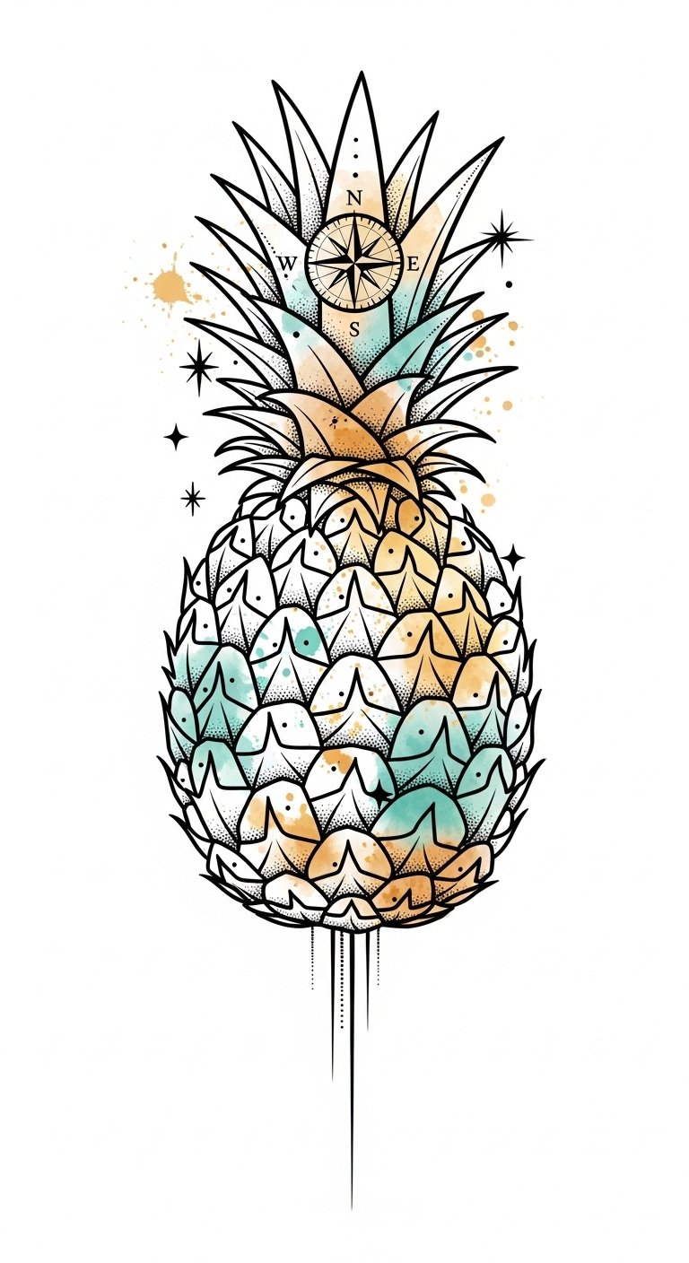 This design concept uses the pineapple as a symbol of warmth, hospitality, and joyful resilience, combining bold, whimsical colors with clean minimalist outlines to evoke both playful energy and personal growth; it suits placements like the forearm for visibility and conversation, the ribcage for a more intimate, personal statement, or the ankle for a subtle touch, and it aims to inspire positivity and individuality while reflecting an adventurous spirit.