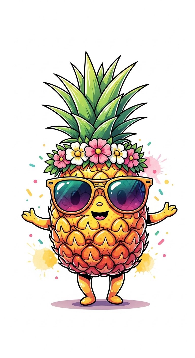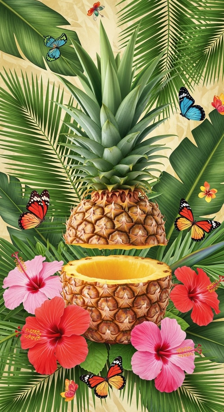 This design blends playful energy and natural serenity: the pineapple as a joyful focal point, palms and hibiscus adding movement and color, butterflies suggesting transformation and lightness.