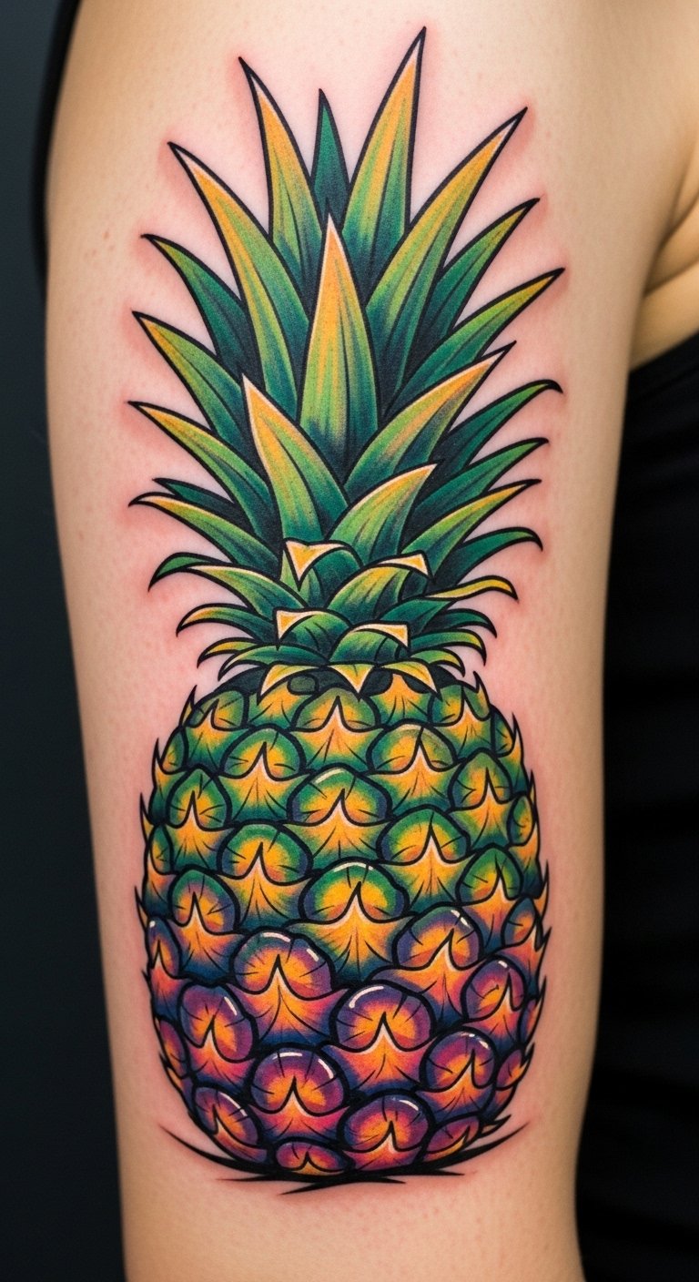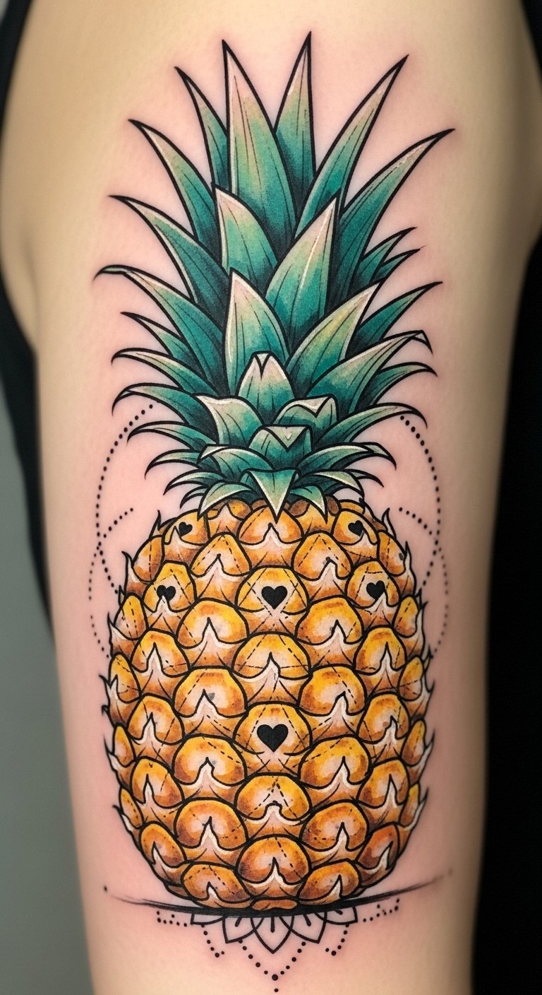 Placed on the upper arm, ribcage, or calf, this design channels the welcoming spirit of the pineapple as a lifelong emblem of hospitality and warmth. Bold colors and crisp linework create a sense of celebration and cultural pride, while intricate texture invites tactile curiosity and close appreciation. Emotionally it reads as an open, generous statement — a reminder to embrace sweetness, adventure, and shared joy — and works well as a standalone piece or as a focal element in a tropical-themed sleeve.