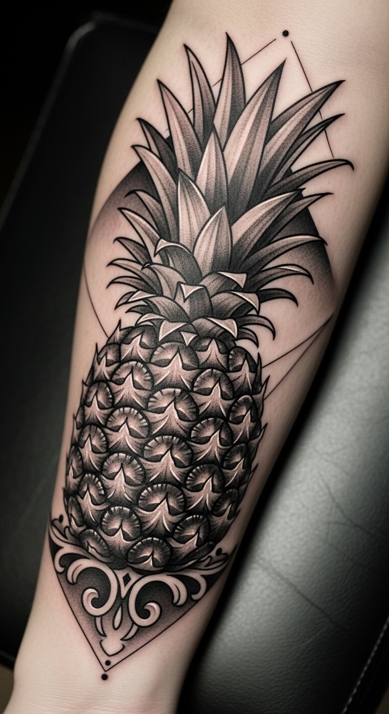 While colorful tattoos capture the eye with their vibrant hues, black and grey pineapple designs offer a striking alternative that embodies elegance and depth.