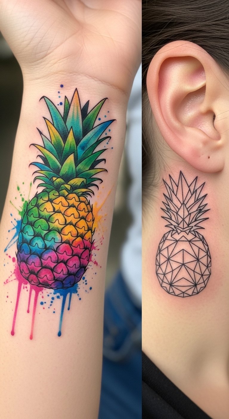 Building on the playful spirit of pineapple tattoos, artistic variations offer a unique twist that captures the essence of creativity. Imagine a watercolor pineapple, bursting with vibrant colors, or a geometric design that embodies pineapple tattoo symbolism. You can explore unique pineapple placements, like your wrist or behind your ear, making your ink a personal expression of freedom and joy in your life. This design celebrates warmth, hospitality, and individuality—watercolor hues convey spontaneity and emotional warmth while geometric lines suggest balance and intention; placed on the wrist it reads as an open, visible invitation to connection, and tucked behind the ear it becomes a private talisman of joy and freedom, evoking uplifted spirit and playful confidence.