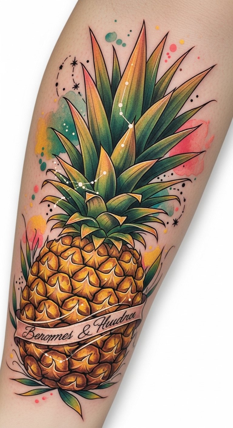 These tattoos blend bold geometric patterns with vibrant colors, creating an eye-catching aesthetic. Abstract designs transform the pineapple into a mesmerizing piece of art, allowing you to express your individuality.