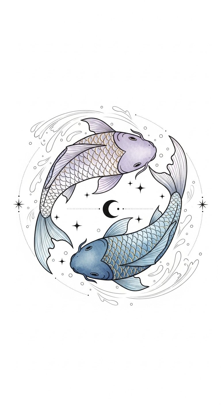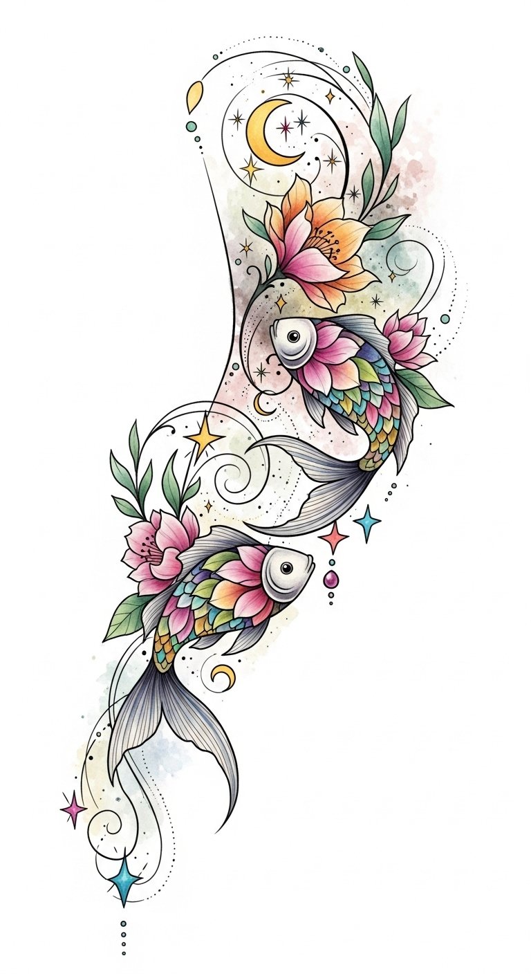 Symbolism and emotion: this design embodies duality, intuition, and fluid adaptability—placing it on the forearm or shoulder lets the natural movement of muscles animate the fish, while a back version creates a contemplative, expansive statement; the watercolor hues evoke emotional depth and calm, the circling fish suggest balance and inner harmony, and the star accents connect the personal symbol to the broader cosmos, inviting connection and quiet reflection.