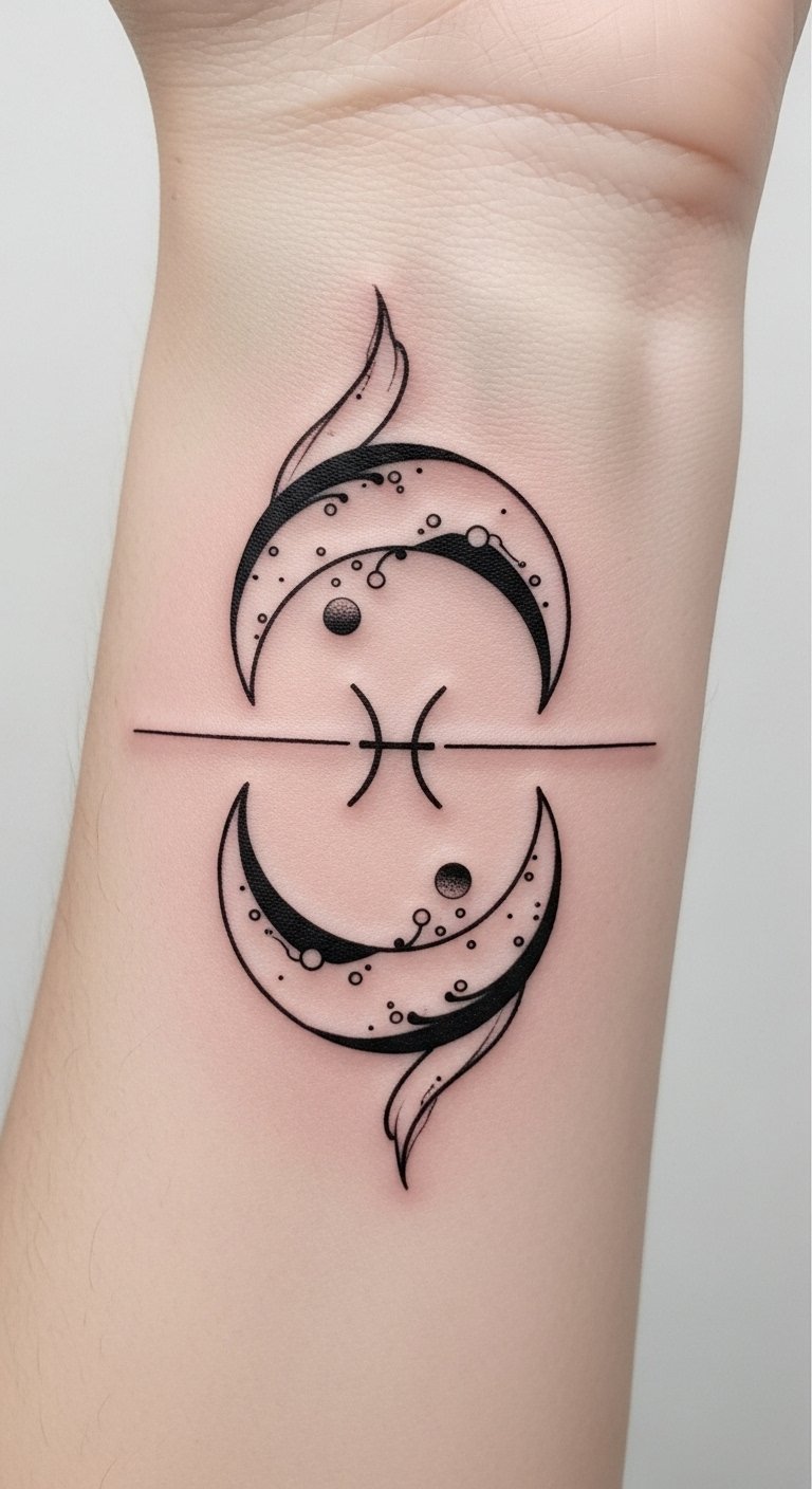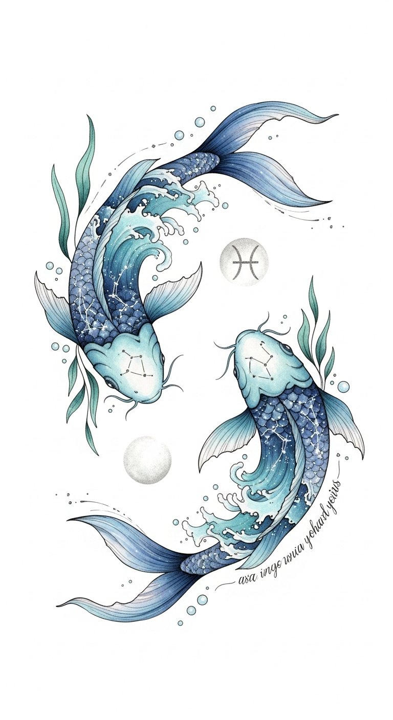 This design places two ethereal fish formed of fine, flowing linework circling a crescent moon and gentle wave motifs, with faint star speckles and a subtle mandala halo; rendered in soft watercolor blues, indigo, and silver highlights for a luminous, otherworldly look. Symbolically it blends Piscean intuition (fish and waves) with cosmic guidance (moon and stars) and inner harmony (mandala), evoking calm, introspective emotion and a sense of connectedness. Ideal placements: inner forearm for visibility and personal reflection, upper back or ribcage for a more intimate, private piece that moves with the body’s flow.