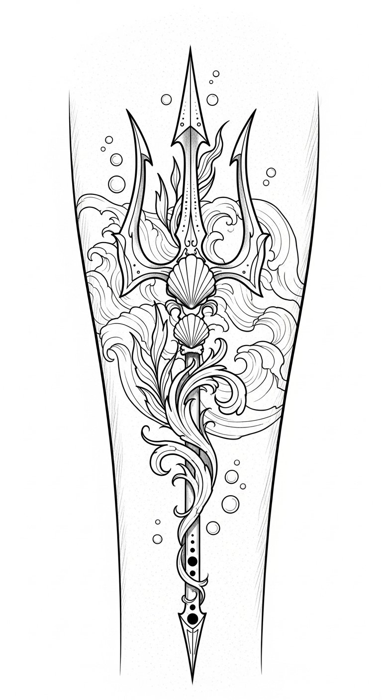 The majestic Neptune trident tattoo captures the powerful essence of the sea god, combining intricate line work with a sense of fluidity.