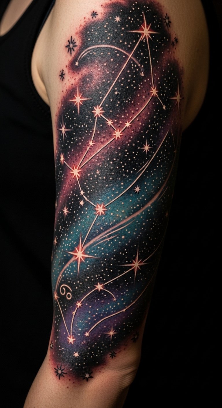 This tattoo blends personal identity and cosmic wonder: the constellation lines map your sign while clusters of shimmering stars add depth and motion, set on a deep, nebulous background to evoke infinite space.