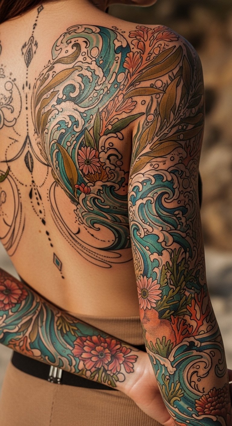 Flowing designs that mimic the movement of water can intertwine with celestial themes, like constellations and moons. These elements create a harmonious story, allowing your tattoo to breathe life, freedom, and cosmic energy into your skin.