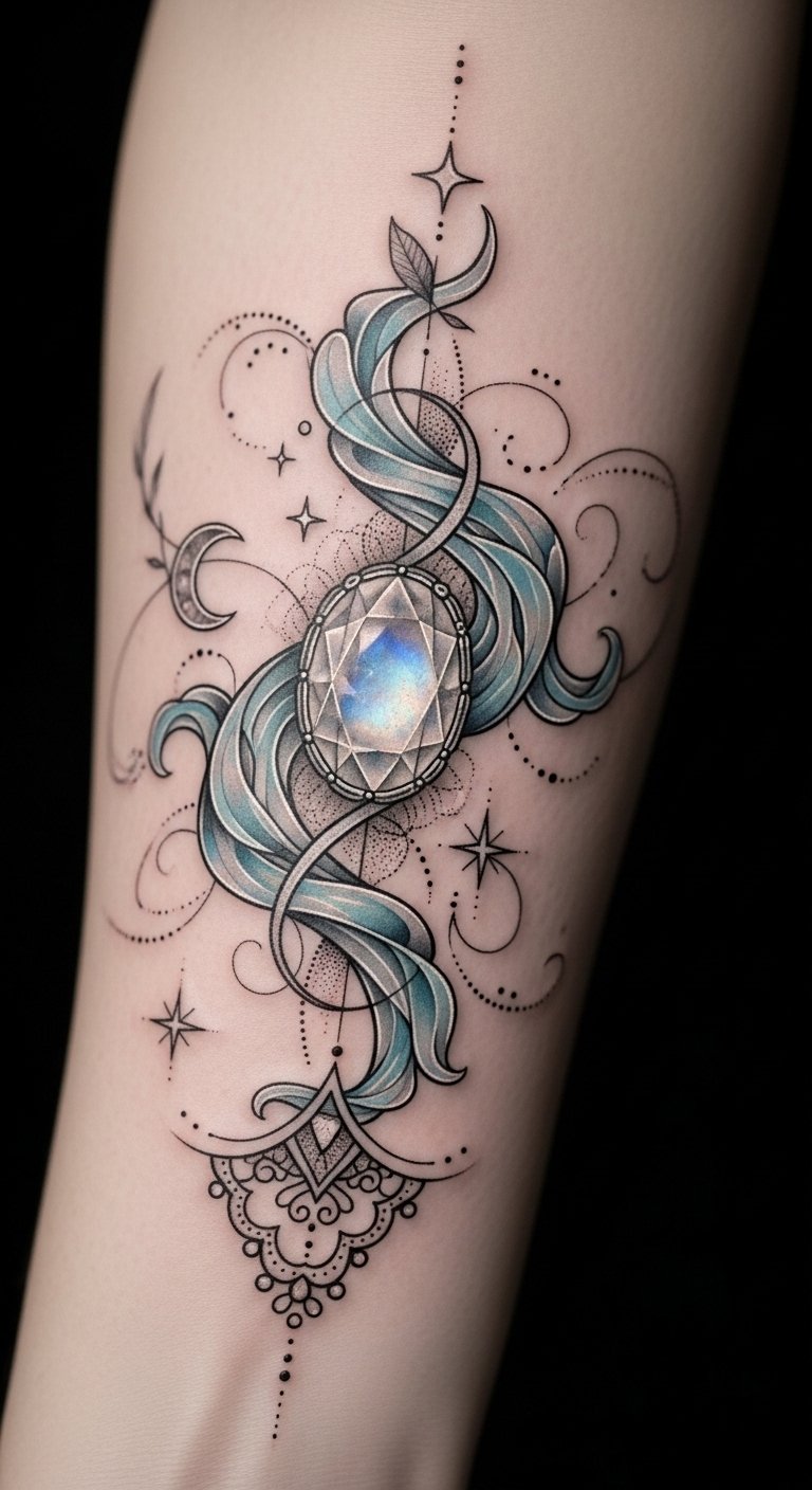 Imagine intricate designs intertwining these gems, reflecting your emotional depth and free-spirited nature. Let these elements guide your tattoo journey, expressing your unique connection to the cosmos.