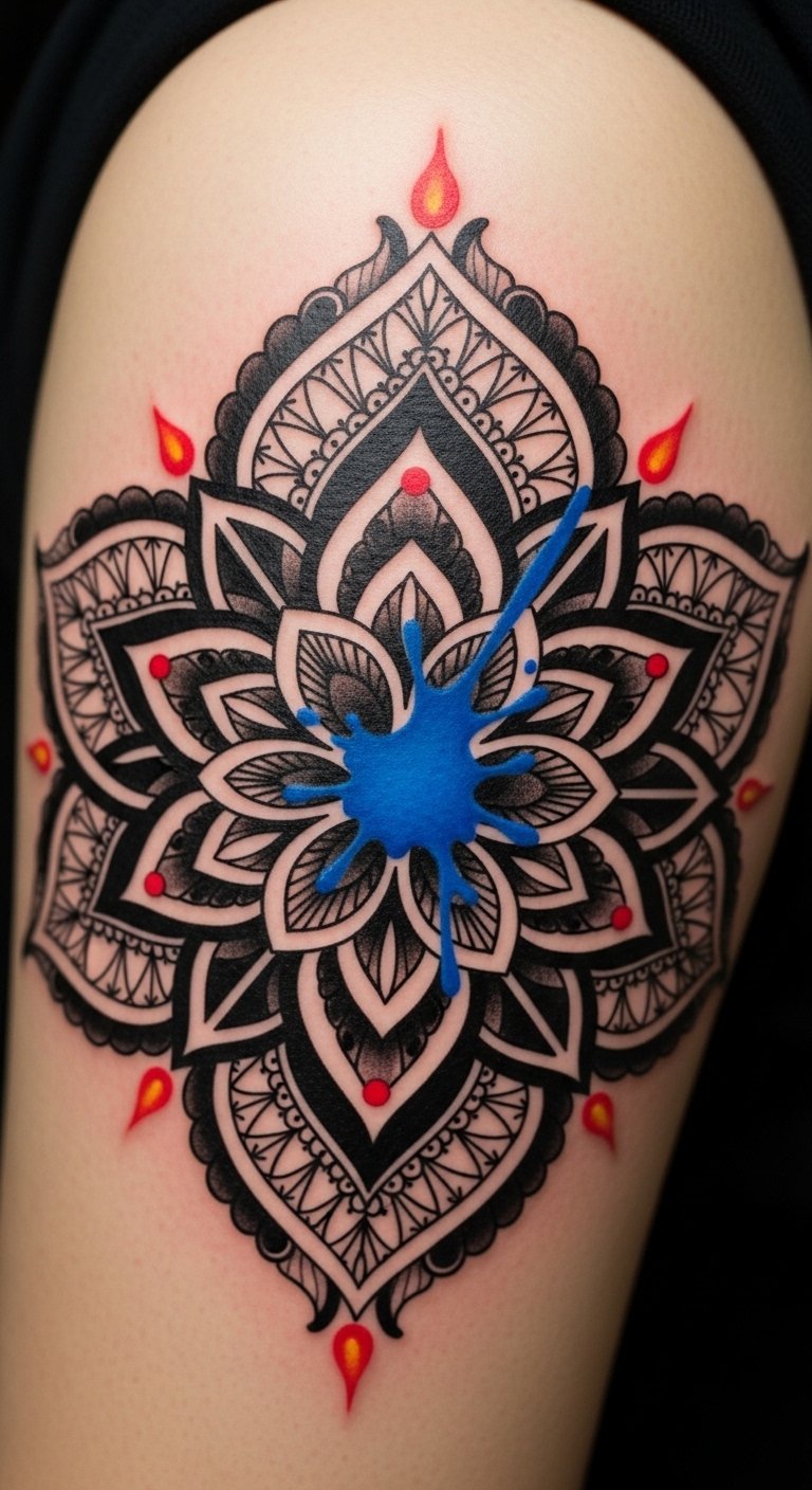 Whether it’s a splash of blue for tranquility or fiery red for passion, these tattoos express your unique spirit while celebrating your freedom to be bold. This design symbolizes balance between structure and emotion—the blackwork mandala grounding the wearer while the blue center evokes inner calm and the red accents spark courage;