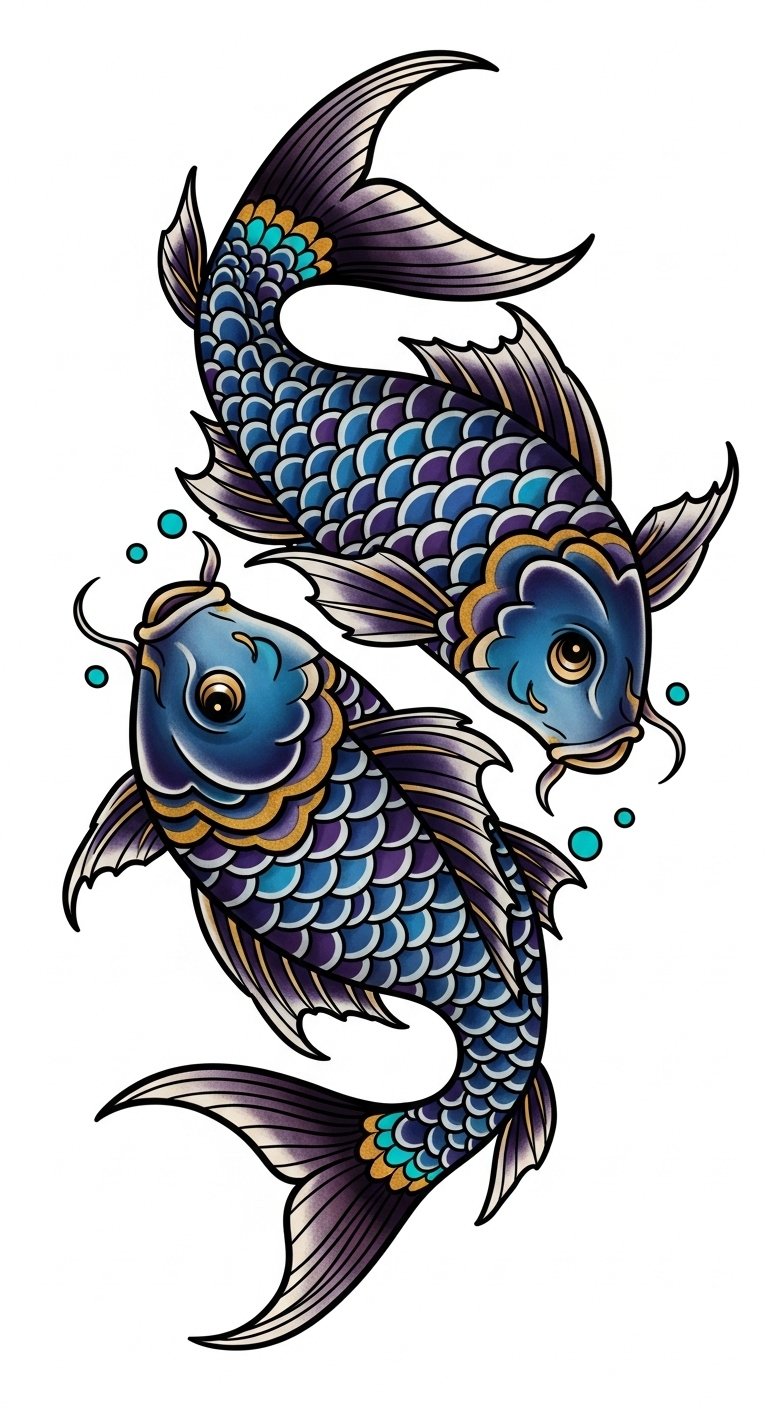 Delicate twin fish curl in opposite directions, their vintage scales rendered in saturated teals, deep indigos, and warm coral highlights with bold black outlines and ornamental filigree; surrounding elements include flowing water ribbons, star clusters, and subtle crescent moons to emphasize intuition and cyclic motion. This design symbolizes duality, emotional depth, and creative freedom, evoking calm introspection and spirited movement; ideal placements are the forearm, ribcage, or upper back where the curved composition can follow natural contours and be shown or concealed to suit mood and meaning.