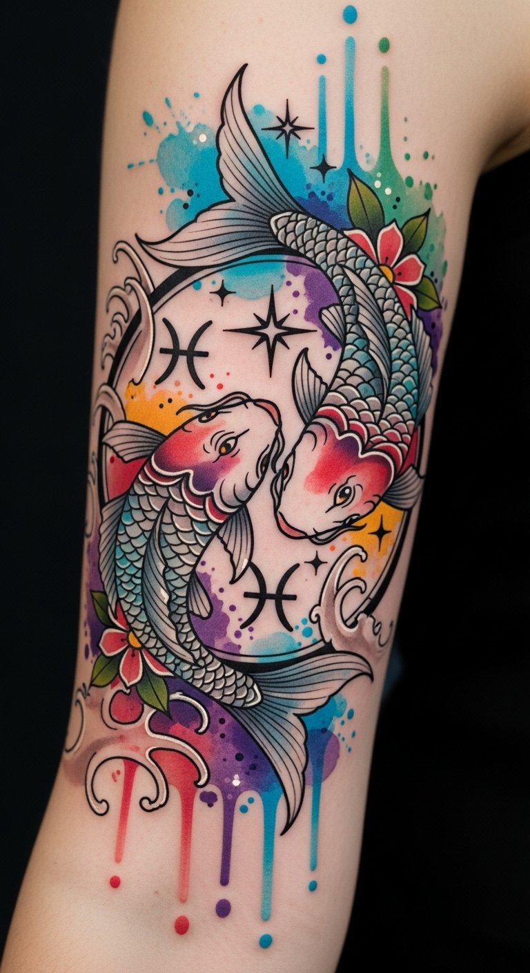 Building on the enchanting allure of neo-traditional Pisces tattoos, watercolor techniques can add an ethereal quality that enhances the fluidity of your design.