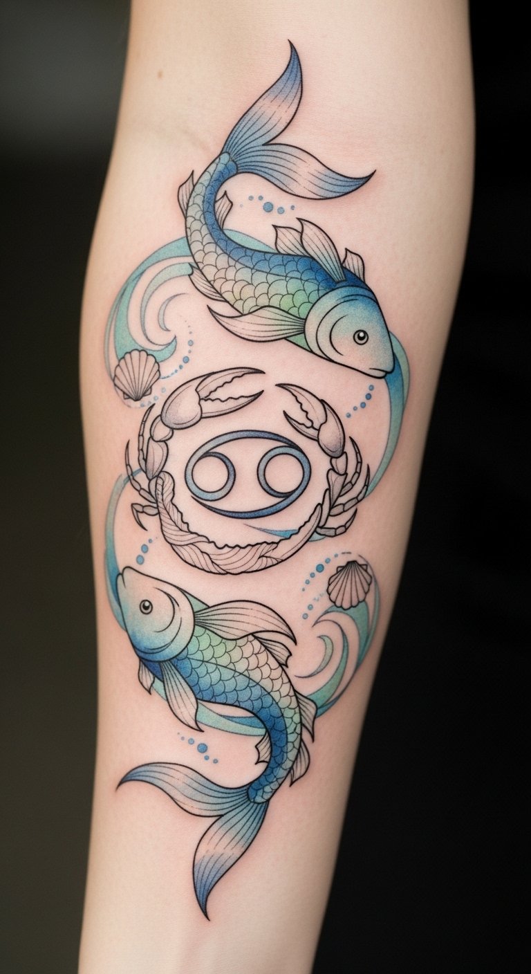 The composition’s flowing lines and watercolor tones evoke oceanic emotion, the crab claw anchors protective energy while the circling fish symbolize empathy and unity; ideal placements are areas that move with the body—inner forearm for visibility and personal reminder, shoulder blade for a subtle emblem, or ribcage for intimate, close-to-heart meaning.
