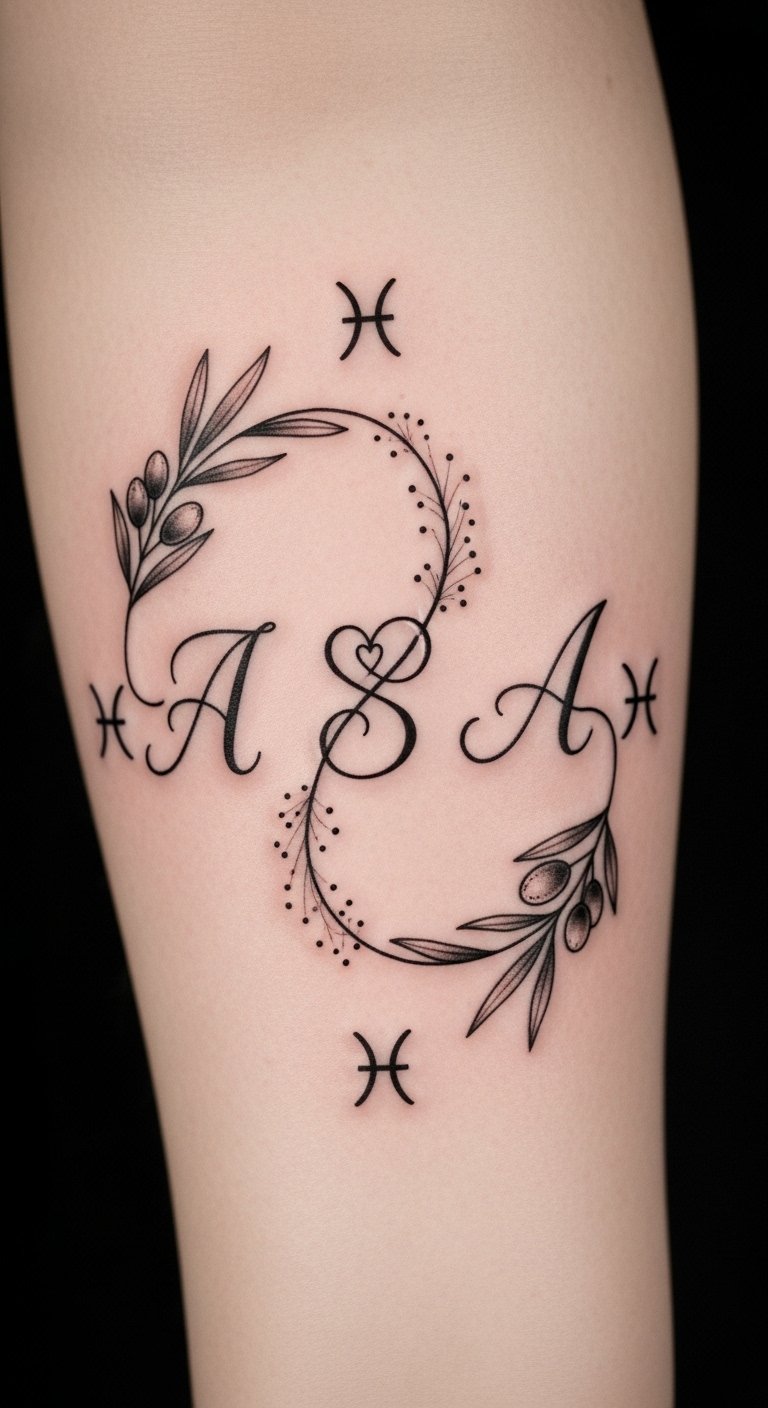 Connection is a powerful force, and family and romantic relationship tattoos beautifully capture that bond. Imagine a design intertwining your loved ones’ initials, symbolizing unbreakable family bonds. Or, choose a heart entwined with Pisces symbols, showcasing your romantic connections. Each inked line tells a story, a tribute to love and unity, allowing you to express your deepest emotions and cherished relationships forever. The looping initials and heart create continuous movement symbolizing enduring connection; Pisces symbols add astrological romance, while olive sprigs suggest peace and longevity. Placed on the wrist or inner forearm, the piece is both intimate and visible, evoking warmth and closeness each time it’s seen.