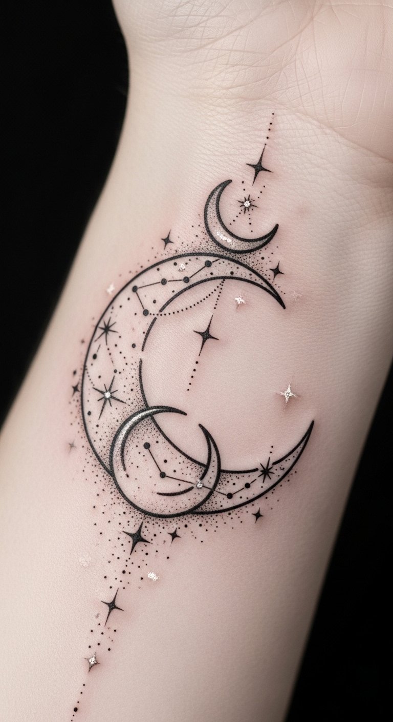 The intertwining moons and stars symbolize cosmic balance, reminding you of the harmony between your personal connections and the universe’s vast beauty. This tattoo concept channels intimacy and timeless connection through delicate lines and subtle shading; placement on the inner wrist or near the collarbone keeps it personal and visible for moments of reflection, while behind the ear offers a discreet, tender reminder of familial bonds and wonder.