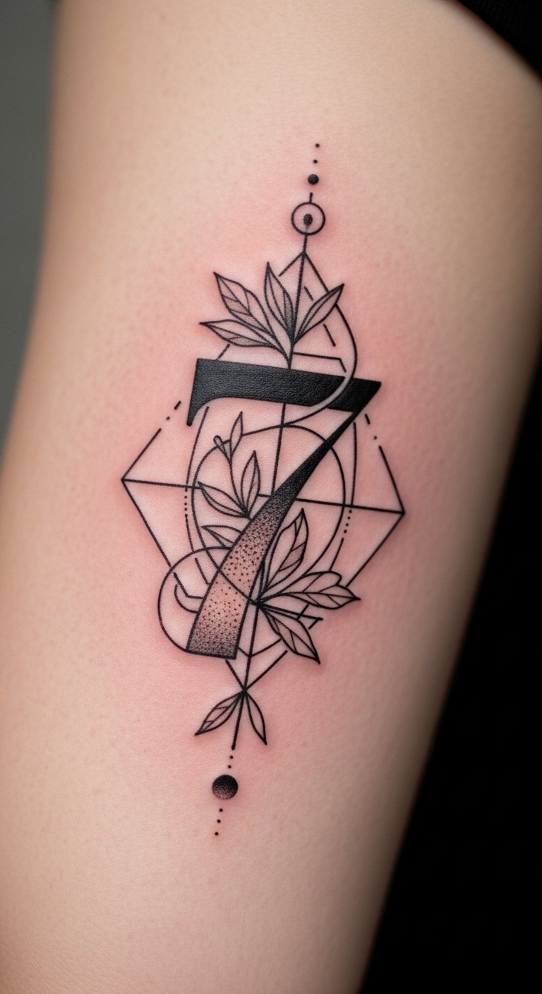 A minimalist tattoo combining a stylized single-digit number—bold, organic strokes—with a subtle ascending vine that weaves through and around the numeral; tiny leaves and a few faint dotwork stars trail upward from the vine, suggesting continuous growth and aspiration. The number anchors the design as the wearer’s core lesson, while the vine and stars symbolize evolving personal growth and limitless potential; ink in fine black with soft gray shading for depth, ideal for inner forearm, ribcage, or along the clavicle where it can be seen for daily affirmation or easily hidden for private significance.