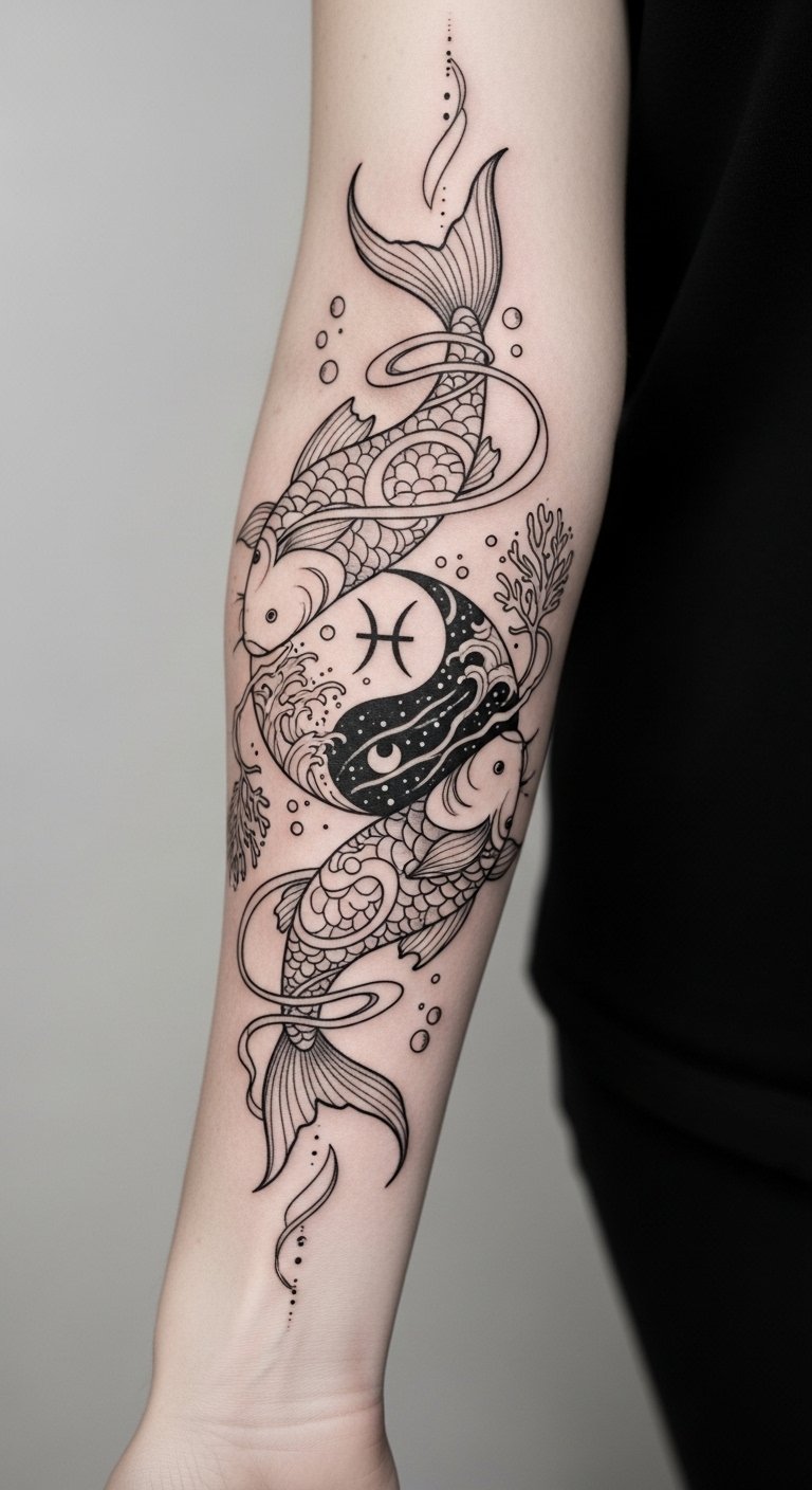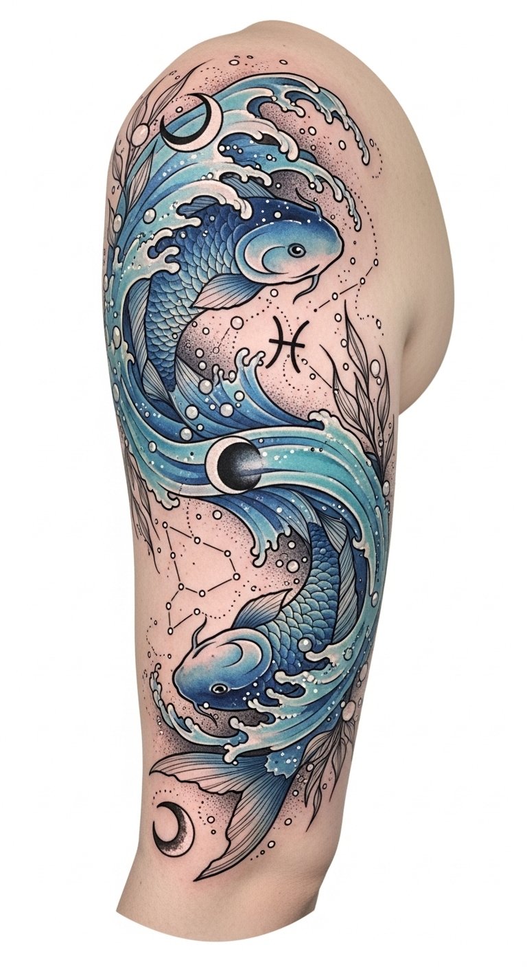 Where to place: a flowing Pisces composition that starts on the shoulder, trails across the upper arm, and can expand into a back piece; imagery includes two koi-like fish circling in a yin-yang formation, delicate watercolor washes of teal and indigo for movement, fine-line star accents and subtle wave patterns to enhance motion.