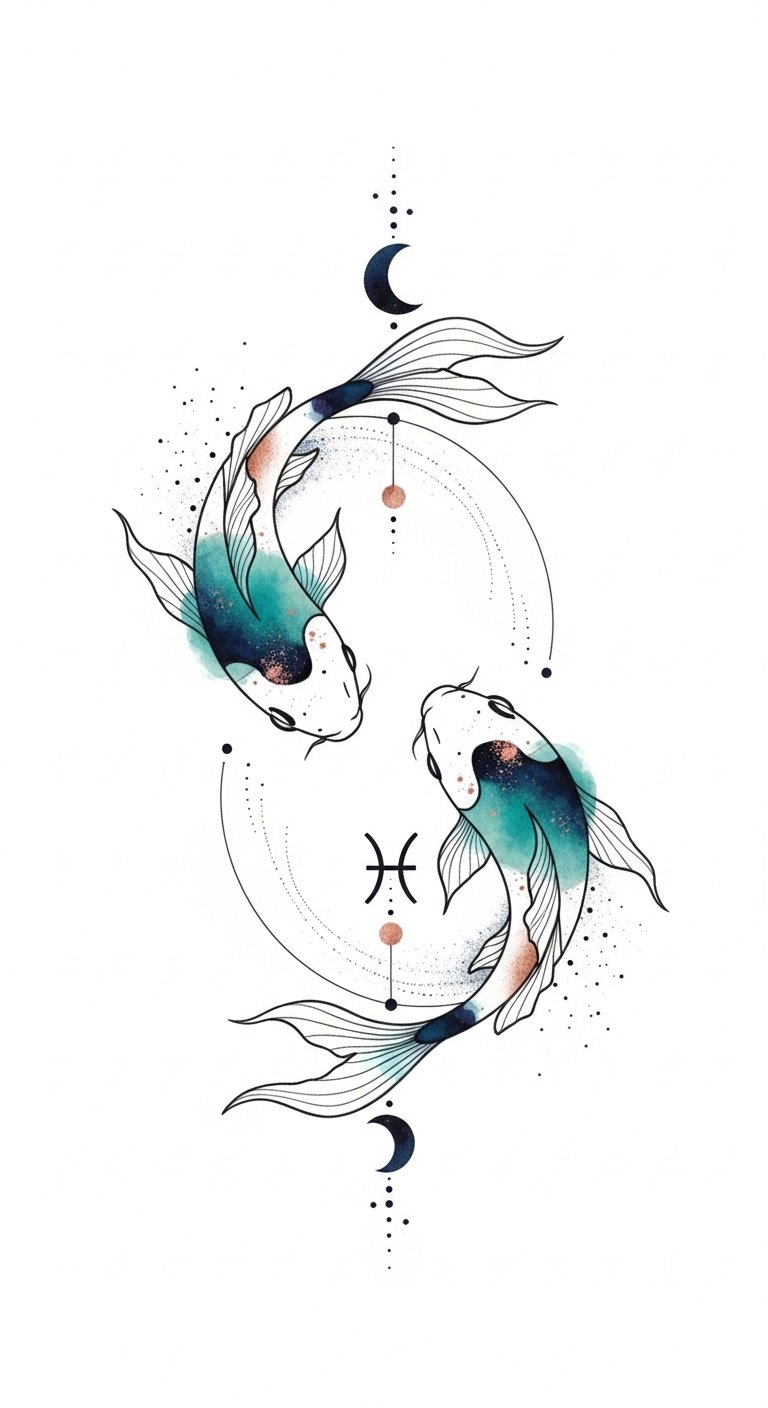 If you’re considering a tattoo that captures the essence of your Pisces spirit, you’ve come to the right place. With designs that range from the serene beauty of two fish swimming in harmony to the striking symbolism of koi fish, there’s something for everyone. Each tattoo tells a story, reflecting your individuality and the emotional depth of this water sign. Let this design symbolize balance, intuition, and transformation—the watercolor hues evoke softness and empathy, the gold lines add spiritual light, and the circular motion suggests continuity; ideal on the wrist, ankle, or behind the ear where its intimate placement complements Pisces’ private, dreamy nature.