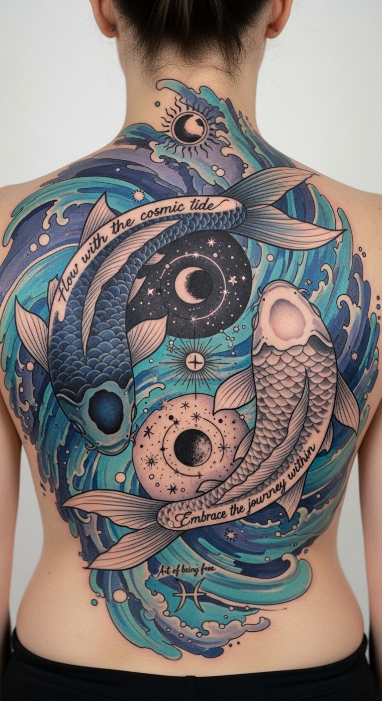 This design blends flowing aquatic lines and interlaced fish with small stars and moon phases to symbolize intuition, duality, and cosmic guidance; delicate script quotes weave through the composition to anchor personal meaning. The emotional tone is introspective and liberating, celebrating self-expression and the harmony between inner depth and outward creativity. Placement options: along the ribcage or forearm for elongation and movement, shoulder blade for a hidden, intimate piece, or calf for a bold vertical display that follows the body’s natural flow.