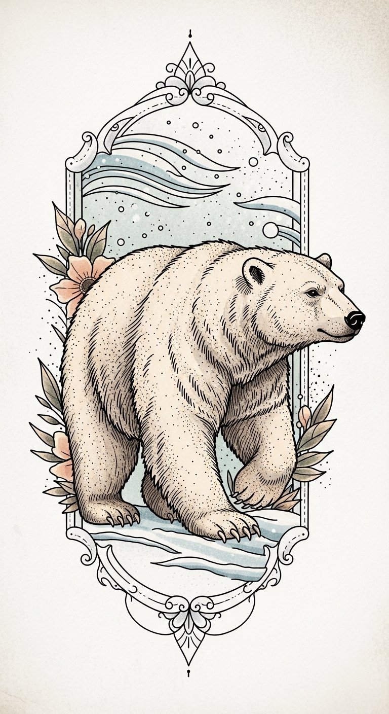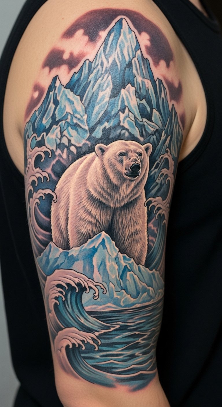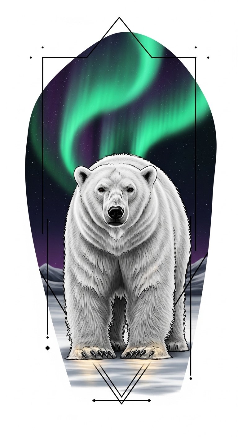 It’s more than ink; it’s a declaration of spirit. Symbolically, the composition blends fluid marine lines with angular glacial forms to represent balance between adaptability and unwavering endurance; emotionally it should feel both serene and formidable, suitable for a forearm or upper chest placement where the bear’s gaze can follow the viewer and the surrounding waves can wrap around the limb or collarbone, allowing movement and scale to emphasize motion and resolve.