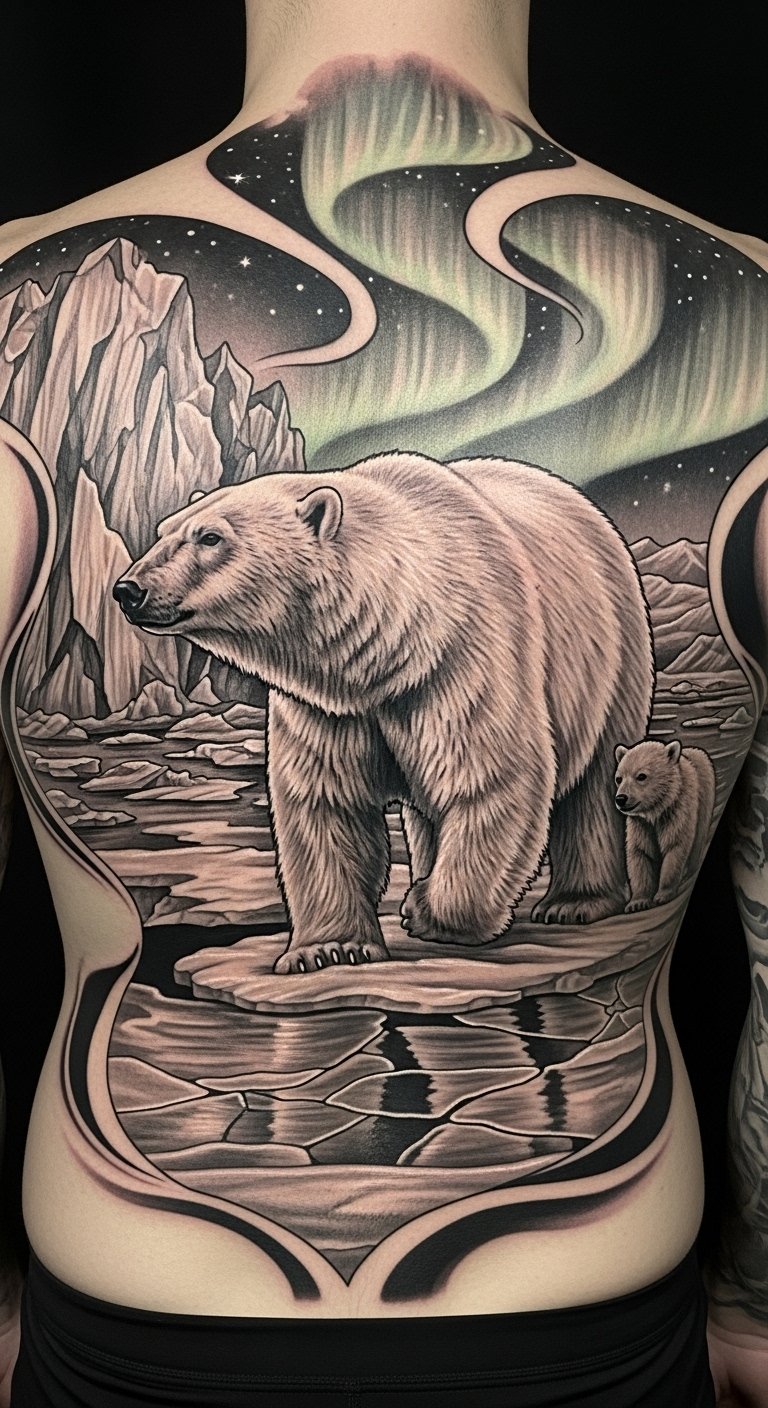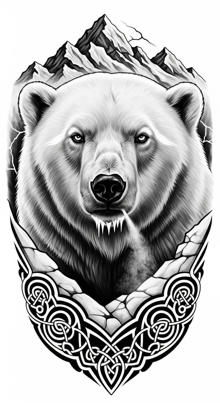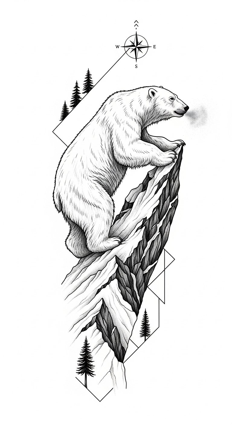 It’s more than ink; it’s a declaration of spirit. Symbolically, the composition blends fluid marine lines with angular glacial forms to represent balance between adaptability and unwavering endurance; emotionally it should feel both serene and formidable, suitable for a forearm or upper chest placement where the bear’s gaze can follow the viewer and the surrounding waves can wrap around the limb or collarbone, allowing movement and scale to emphasize motion and resolve.