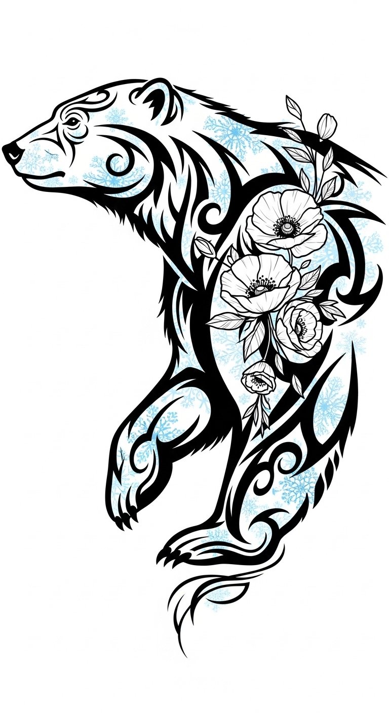 The tribal polar bear tattoo design embraces the raw spirit of nature, intertwining the powerful silhouette of this iconic creature with intricate floral accents.