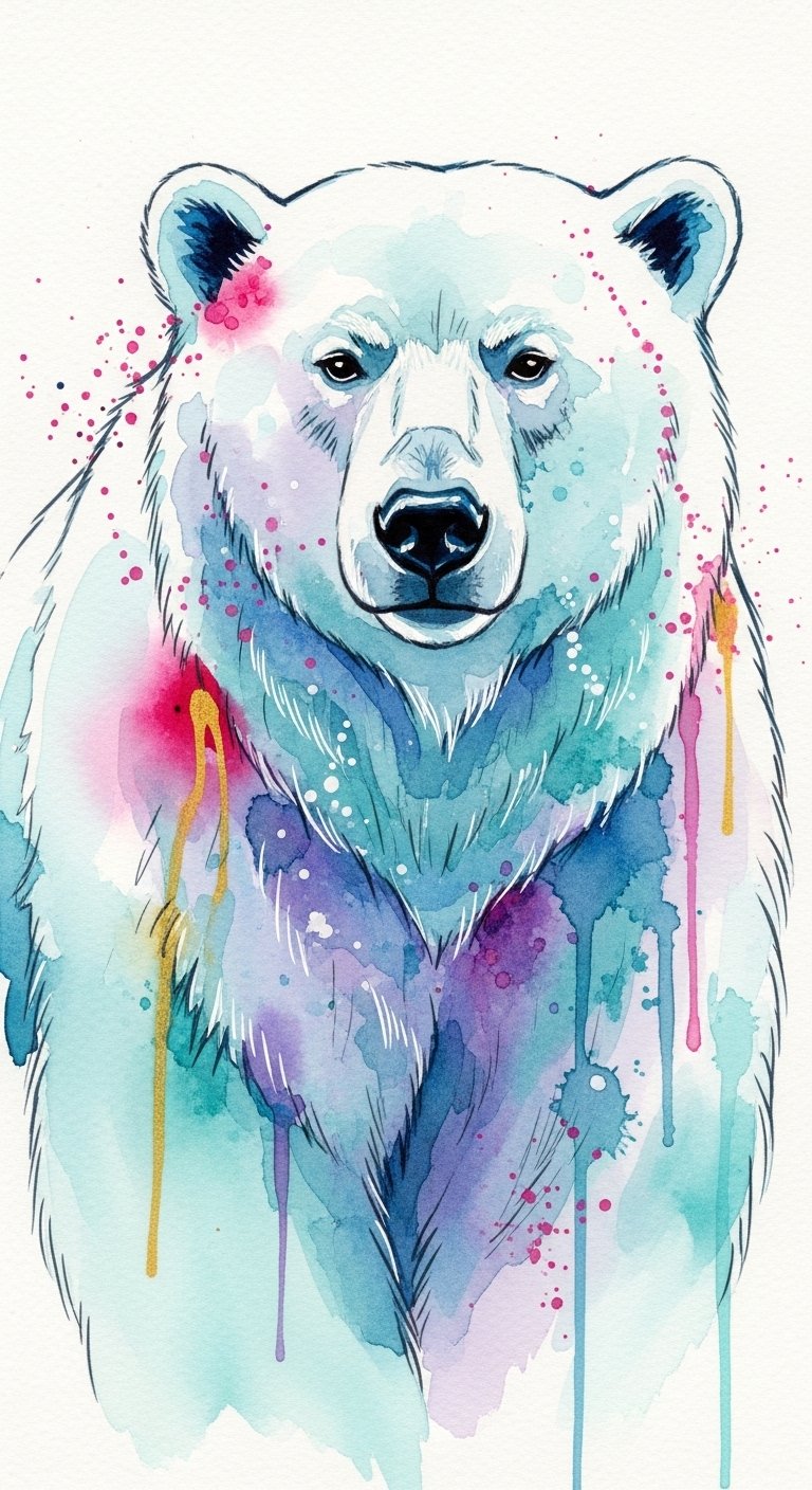 This design uses stark contrasts, flowing lines, and textured shading to evoke cold air, ice ridges, and endless horizon; the bear’s gaze communicates resilience and vulnerability, blending realism with subtle abstract elements like wind-blown snow and a faint aurora.