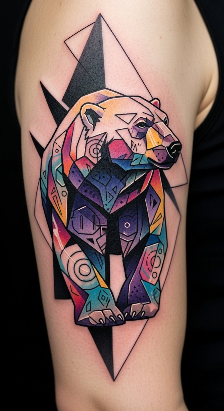 Abstract polar bear tattoos with geometric patterns carry symbolism of resilience, solitude, and guardianship; the angular geometry contrasts with organic fur textures to evoke controlled power and modern identity.
