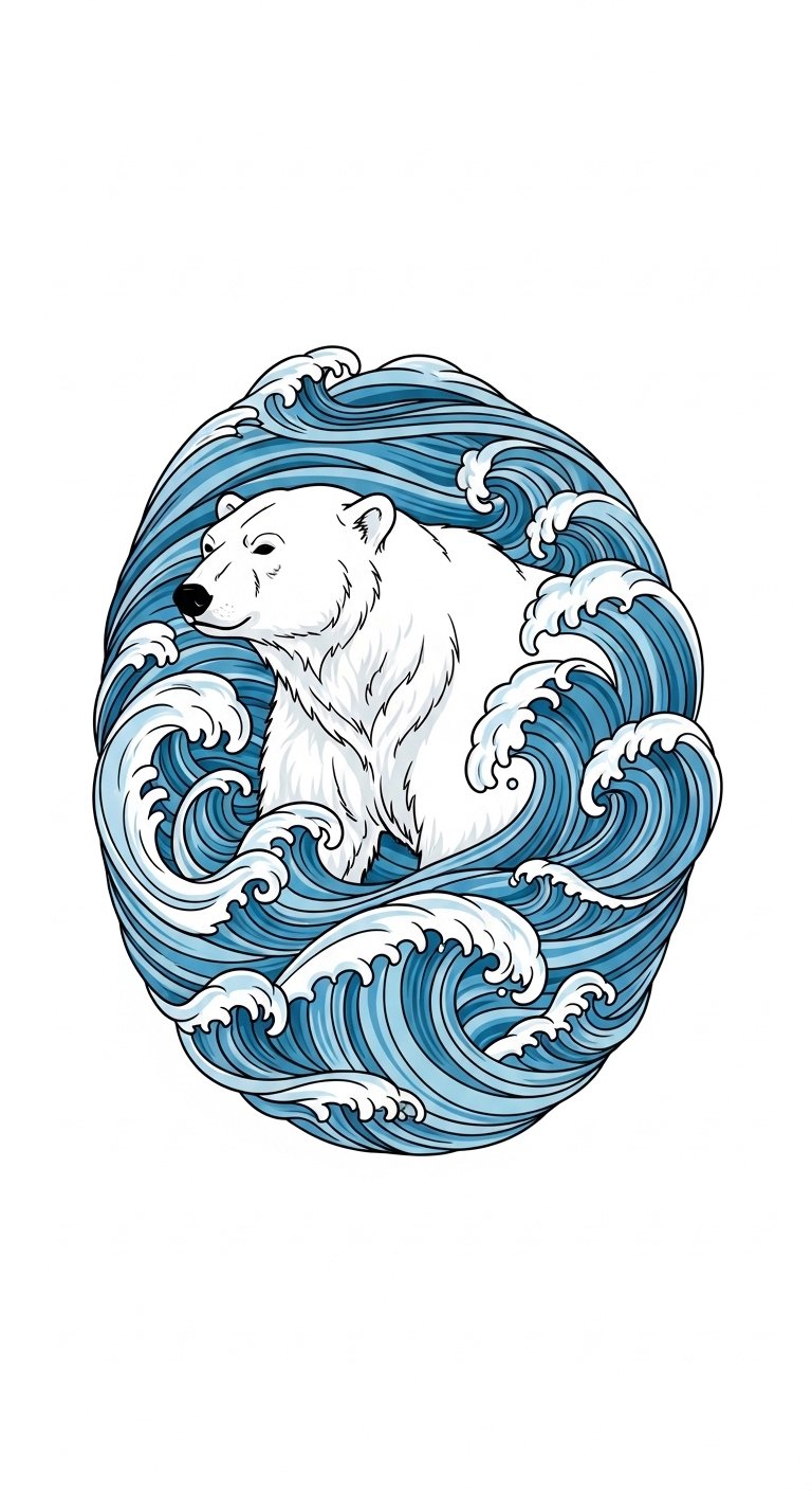 As a tattoo concept, place this composition on the upper arm, shoulder blade, or ribcage where the curve of the body complements the embracing waves and the bear’s form; use bold linework for the bear with flowing, stylized wave patterns in stippling and gentle shading to create movement and contrast.