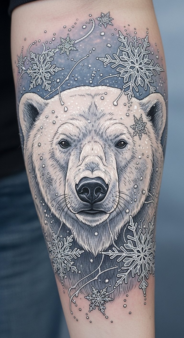 Embracing the serene beauty of the Arctic, a polar bear adorned with delicate snowflakes creates a stunning visual narrative on your skin.