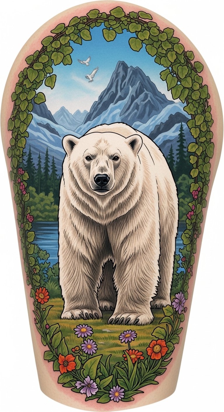Embracing the beauty of nature, this tattoo concept centers on a realistic yet slightly stylized polar bear within a circular frame of alpine flora, icy textures, and subtle aurora accents. The design balances soft shading and fine linework to convey fur texture and landscape detail, making it ideal for a forearm, upper arm, or back placement where it can be sized between 3–6 inches for visibility and detail.