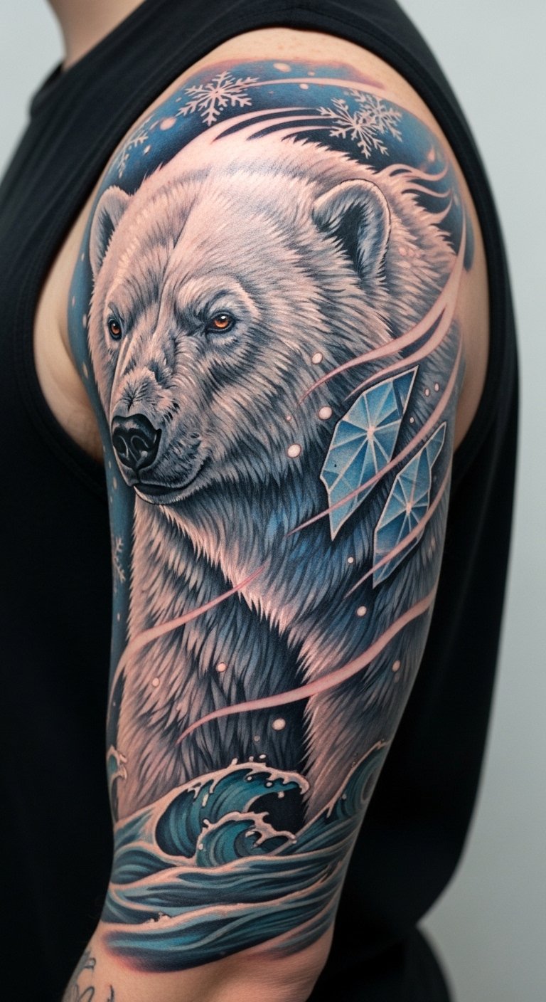 The design’s icy colors and wind-swept lines evoke cold clarity and endurance, while geometric ice shards add modern structure; placement on the upper arm allows the bear’s gaze to follow movement, creating a personal totem that connects emotion, resilience, and the raw beauty of nature.