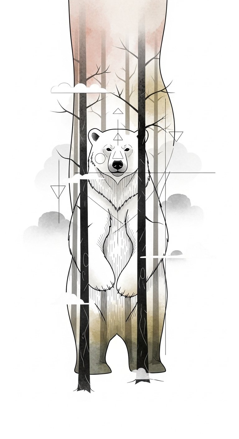 This tattoo concept channels that narrative: the bear and peak represent endurance and triumph, the monochrome with blue accents evokes cold clarity and calm resolve, and the geometric framing adds modern structure.