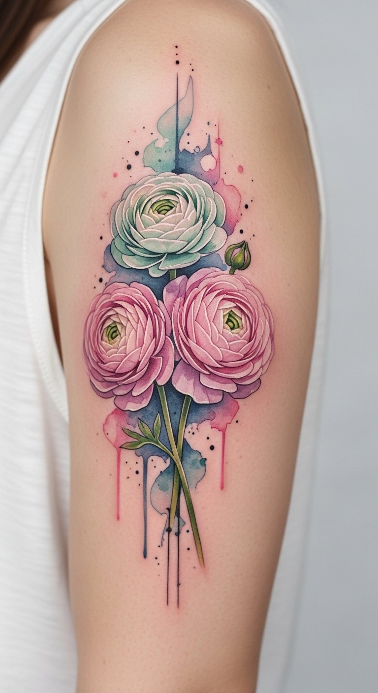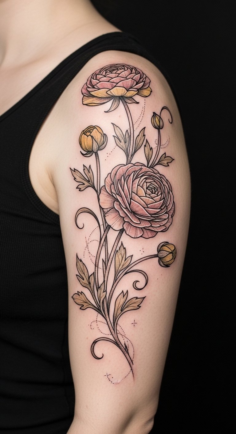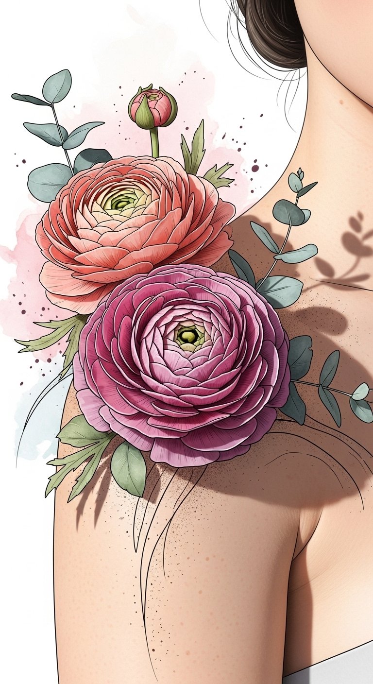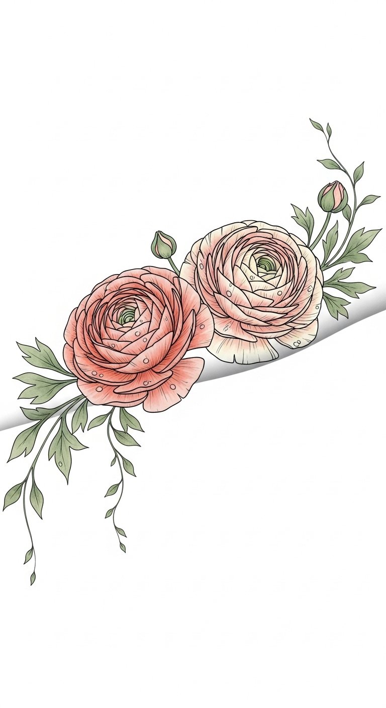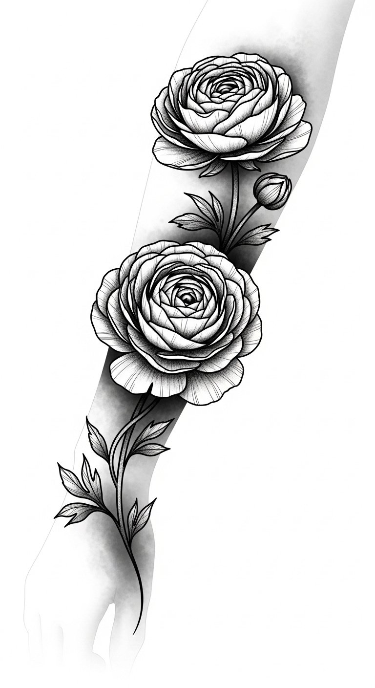 This design pairs lifelike ranunculus blooms rendered in soft gradients and fine line detail to evoke tenderness and vitality; place along the outer forearm or shoulder blade to allow the cluster to flow naturally with the body’s contours and read as both intimate and bold.