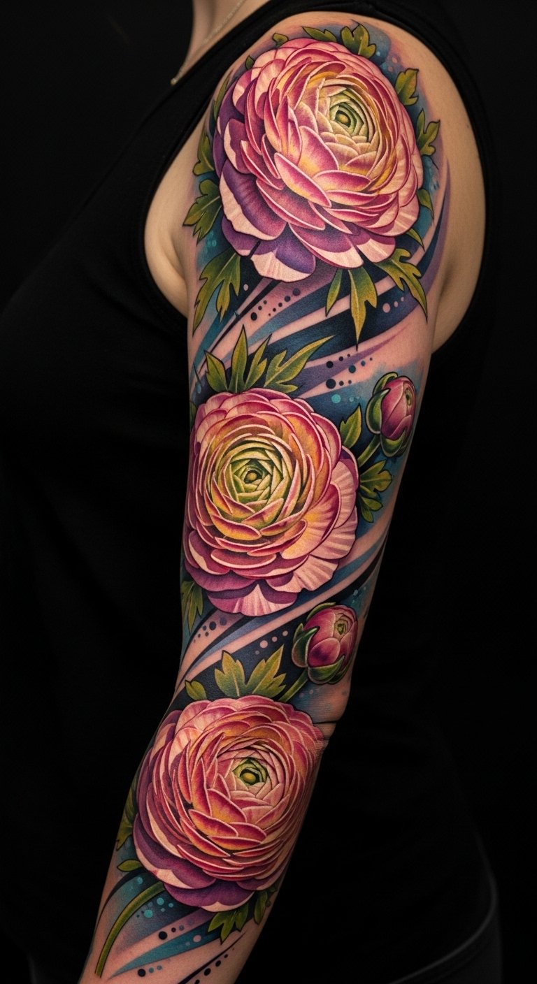 A large colorful sleeve featuring ranunculus blossoms transforms your arm into a vibrant canvas, bursting with life and symbolism.