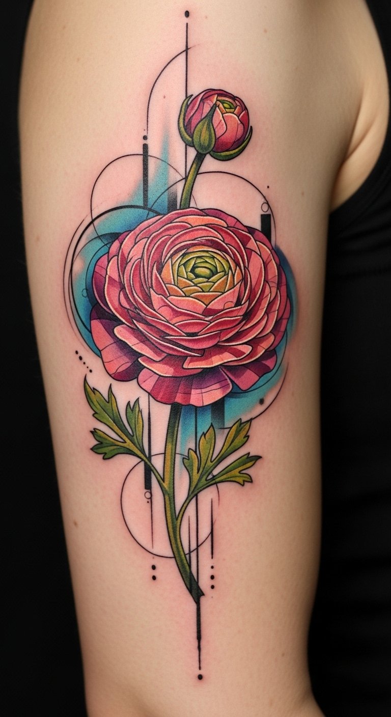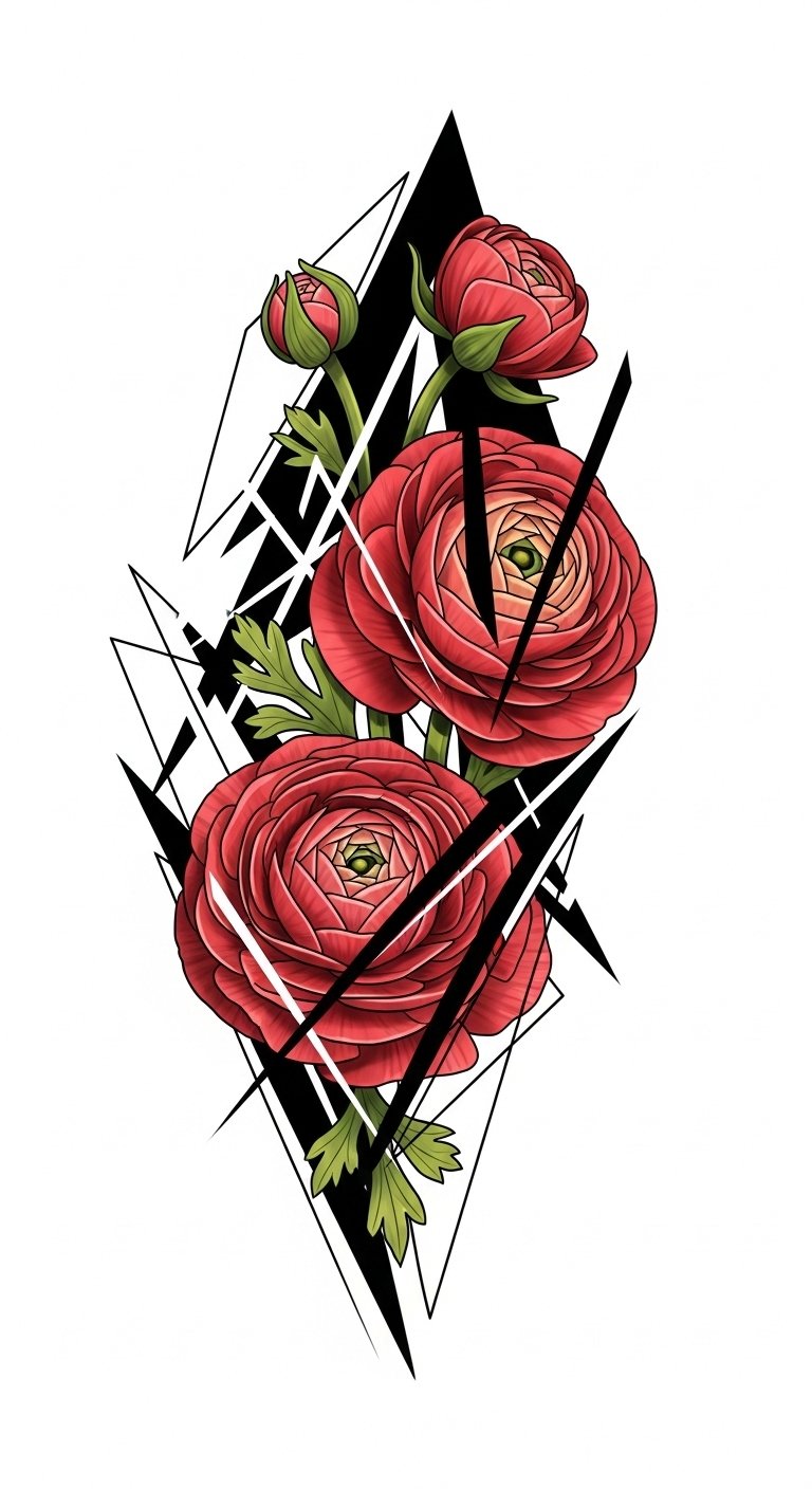 This design pairs the lush, layered petals of ranunculus with precise geometric elements—triangles, hexagons, and intersecting lines—to symbolize balance between emotion and logic, growth and structure.