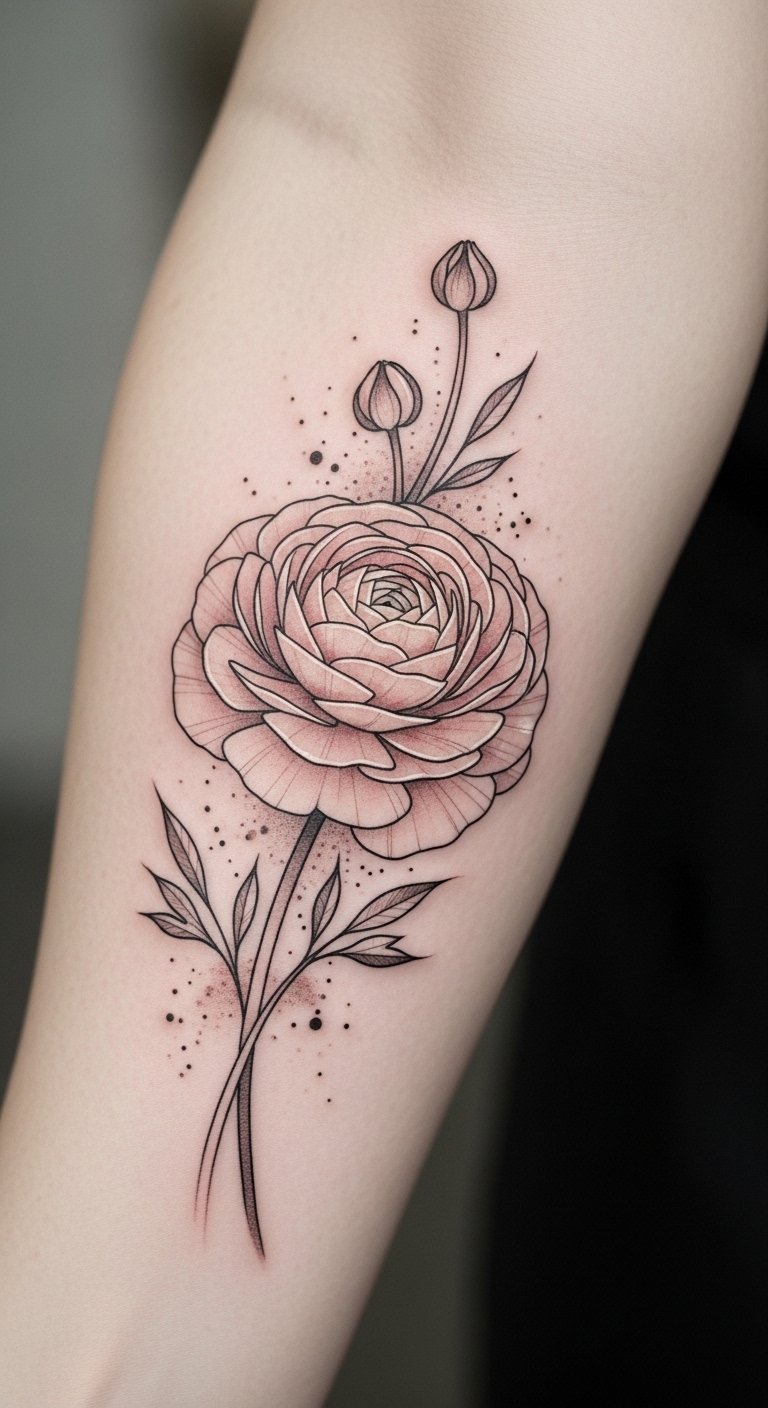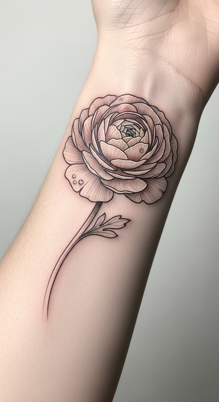 This ranunculus concept symbolizes layered emotions—romance, resilience, and personal growth—evoking nostalgia while affirming individuality; rendered in fine-line blackwork with soft shading and occasional muted color accents, it feels both antique and contemporary.