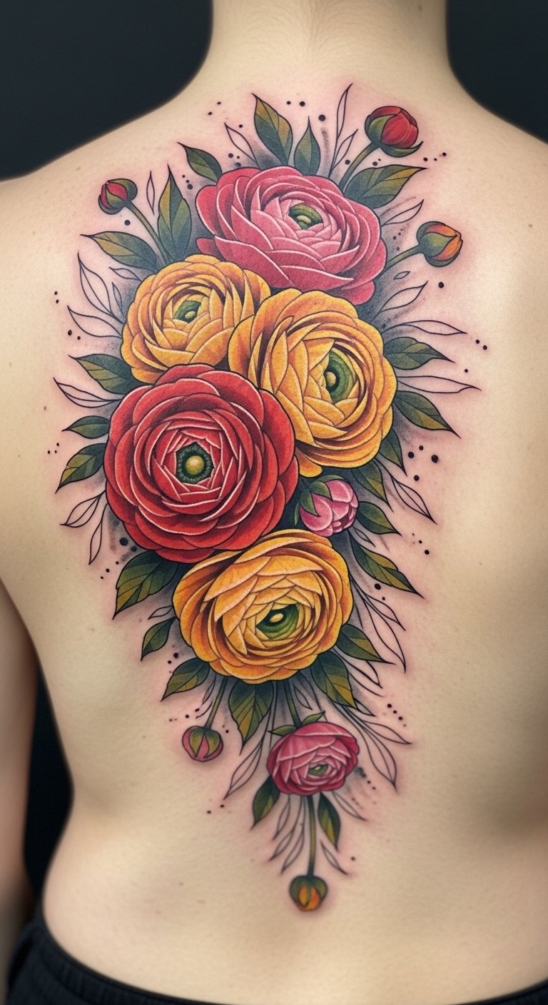 While you may seek a bold statement piece, a vibrant ranunculus bouquet tattoo on your back captivates with its explosion of color and life.