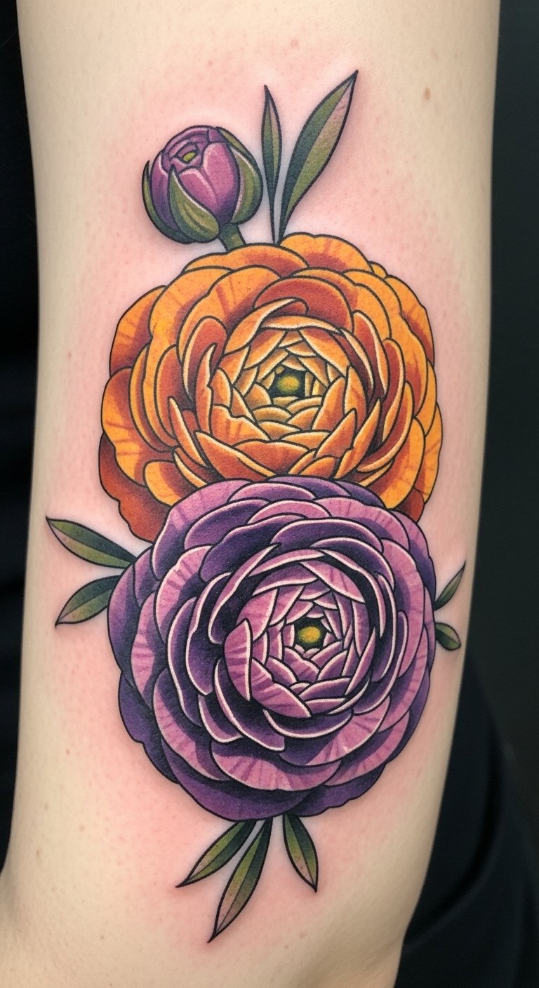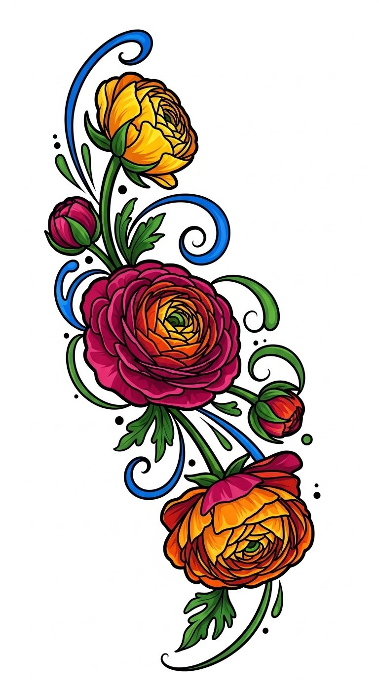 The ranunculus blooms rendered in saturated jewel tones and thick, confident outlines convey passion, resilience, and personal liberation; layered petals suggest complexity of self, while the bold neo-traditional style gives the piece a timeless, statement-making quality.