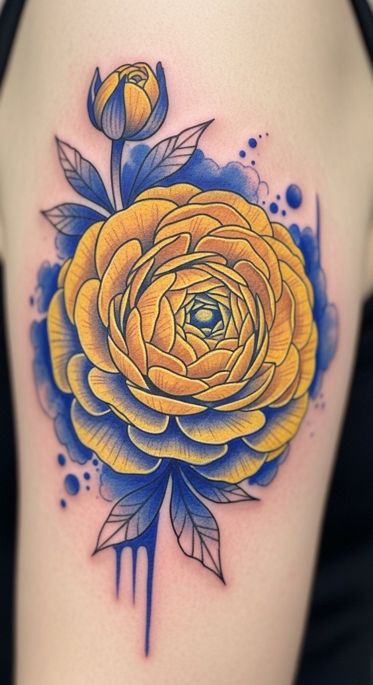 Consider placing the design on the outer forearm or shoulder blade where the curve of the body accentuates the bloom; the bright and deep colors symbolize joy and introspection, respectively, creating dynamic emotional balance while the realism invites intimate viewing.