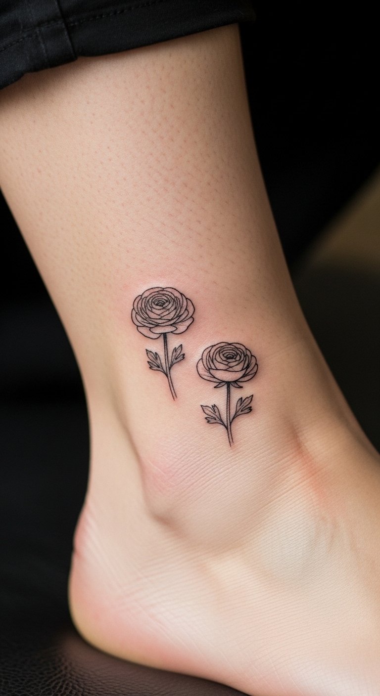 Tiny ranunculus on the ankle symbolizes refined beauty, resilience, and quiet confidence; placed where it can be shown or hidden at will, it evokes personal freedom and intimate elegance.