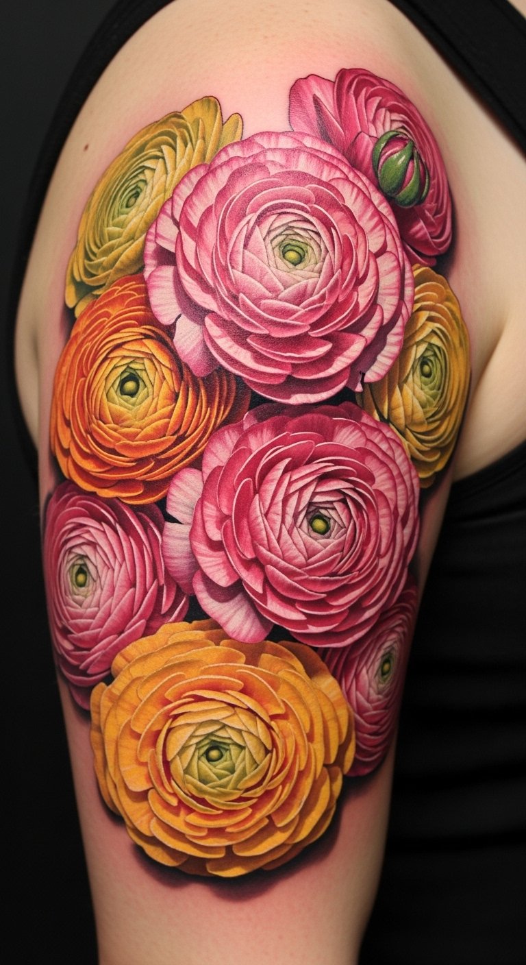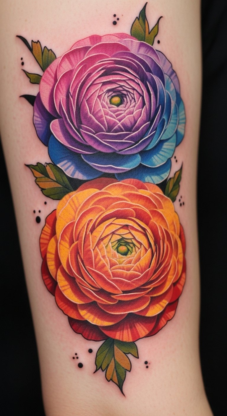 A sleeve or shoulder placement enhances the flowing petal transitions, allowing the color gradations to wrap naturally around the form and catch light from different angles; the ranunculus symbolizes radiant renewal and layered emotions. Its layered petals represent personal growth and resilience, while the vibrant gradient evokes joy, transformation, and a liberated spirit—ideal for someone wanting a bold, feminine, and expressive statement piece.
