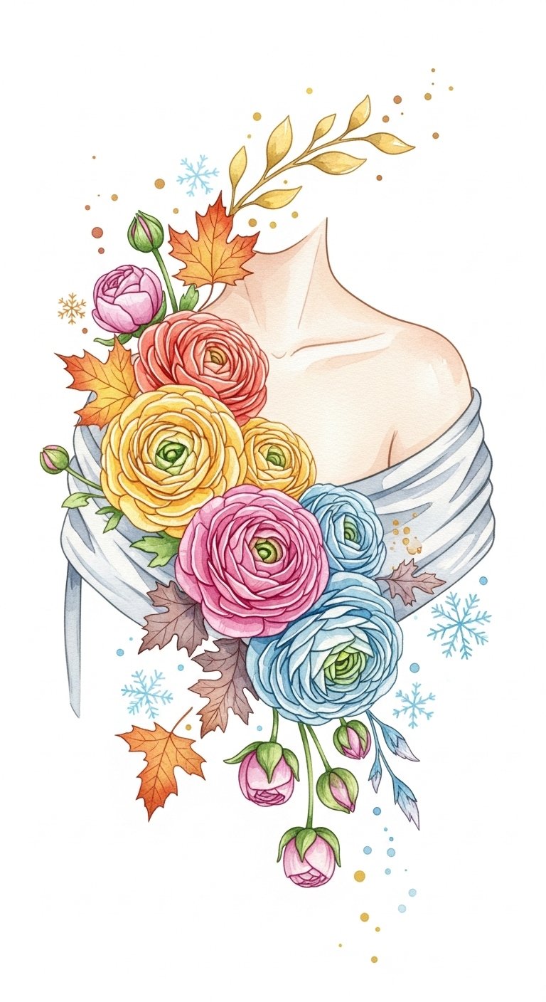 These watercolor ranunculus designs symbolize renewal, tenderness, and the fleeting nature of beauty; their layered petals and translucent washes convey vulnerability and quiet strength.