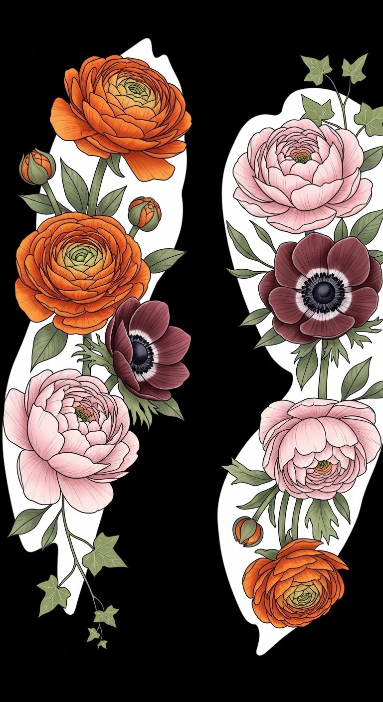 Let your ranunculus reflect the freedom and beauty of nature’s cycles. This design evokes the cyclical rhythm of life and personal growth, blending warmth and coolness to express transition, renewal, and lasting beauty; ideal placement along the shoulder to forearm allows the elements to flow with your movement, creating an intimate, expressive statement that can be scaled or adapted as a sleeve, cuff, or standalone piece.