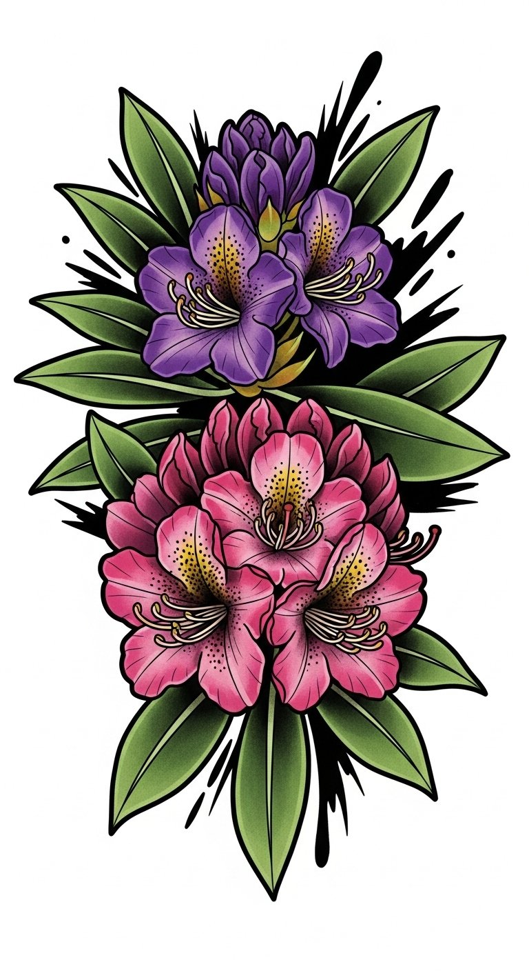 This design concept centers on a dynamic cluster of rhododendron blooms rendered in neo-traditional style: saturated magentas, coral oranges, and deep emerald leaves framed by strong black outlines and selective white highlights for depth.