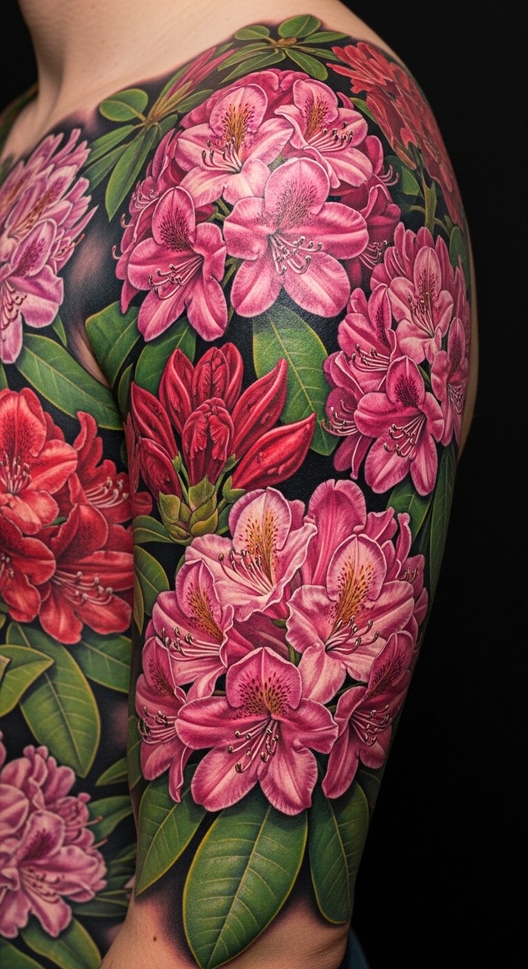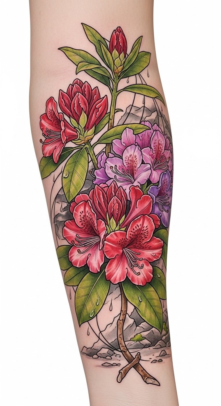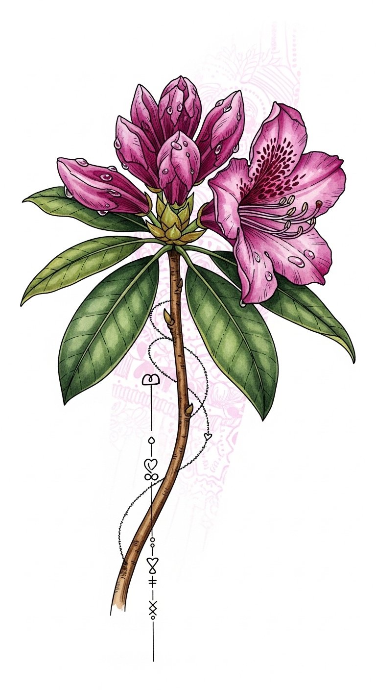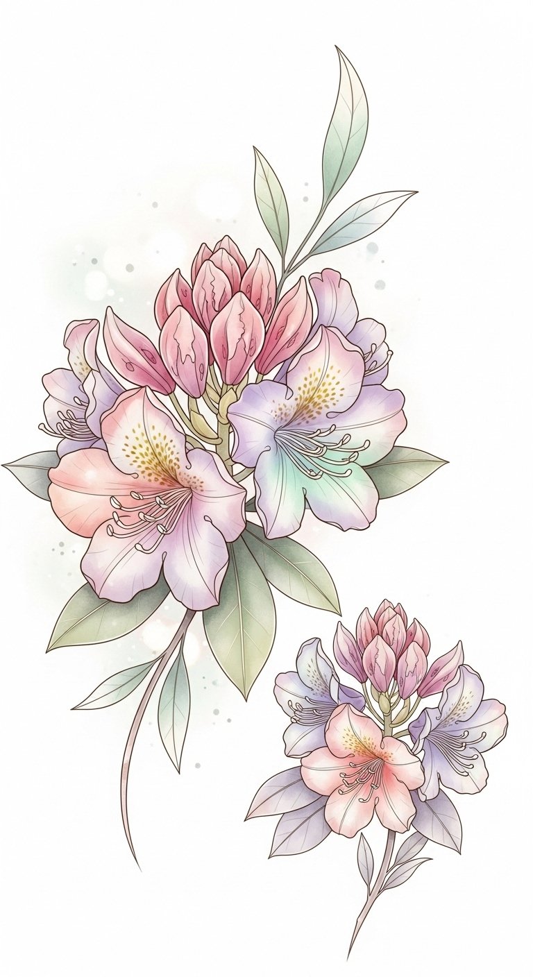 A flowing, botanical tattoo design that captures the original text’s imagery: a cluster of rhododendron blooms in varied sizes and colors (soft pinks, deep magentas, creamy whites), layered with textured leaves and subtle dew drops, composed to follow the curve of the shoulder blade or forearm. Symbolically, the rhododendron represents resilience, beauty, and a connection to natural freedom; emotionally the piece balances delicate grace with bold presence, evoking both tranquility and vitality. Placement options: across the shoulder/upper back for a sweeping, expressive display, or as a vertical forearm piece for a more intimate, wearable statement.